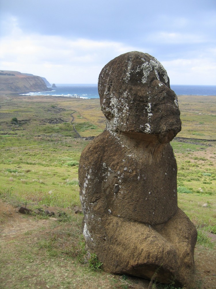 The Dutch explorer Jacob Roggeveen “discovered” Easter Island on the 5th of April in 1722 (easter, hence the name), giving the first accounts of the inhabitants and tall (around 2 metres) and they had distended earlobes with great discs in them. On the early visits of Europeans in 1722 and 1770 (Spanish) all statues were standing up, when James Cook visited in 1774 many were reported toppled. The huri mo’ai – the “statue-toppling” – continued into the 1830s as a part of internal conflicts among islanders.