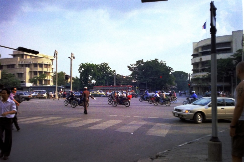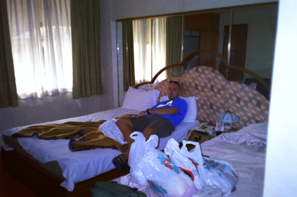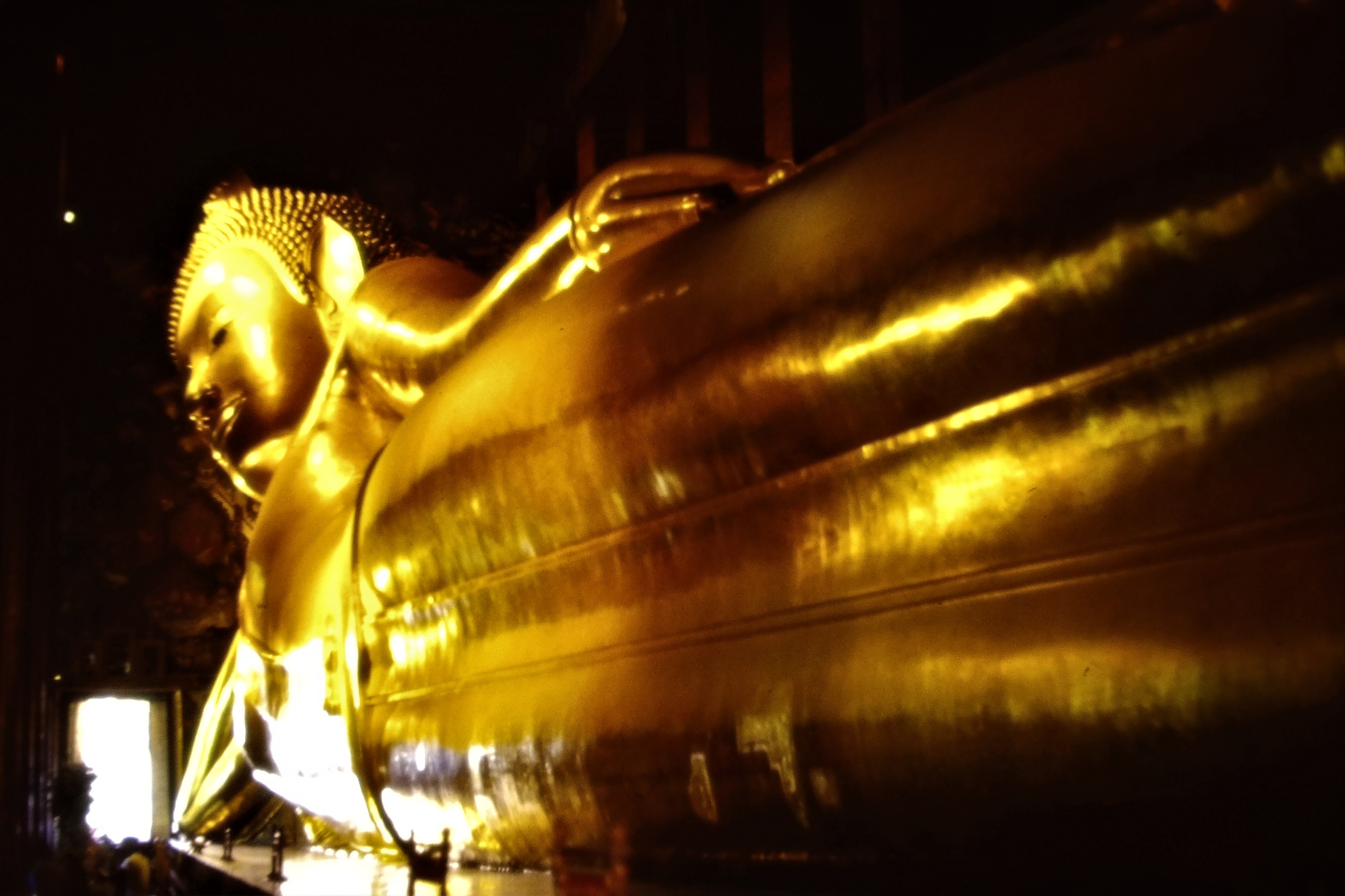 Slept in today… Awoke at around 7 a.m., but thought we’d get up around 8, so we got back to sleep, and didn’t get up until 1 p.m… A couple of biscuits and some coke for breakfast before embarking on a walk in about 35 degrees Celsius. My goodness – the traffic! There seems to be no respect for pedestrians, so it feels like you’re risking your life to cross the road. Have been proper tourists today and taken lots of photos. We went to the area with the Royal Palace – impressive construction! Quite colourful and golden, really different from anything we’ve seen before. Was told off by a guard for having my feet facing a buddha in a temple – they are not to be visible… Went to another temple; Wat Po, with a 46 metre long reclining buddha. Exhausted after just a few hours outside; hungry, thirsty and slightly faint, so we went back to the hotel for some relaxation. Then to Hello restaurant, sent some emails back home, watched Mr. Bean on video. Back at the hotel room now, watching an Indian version of MTV.