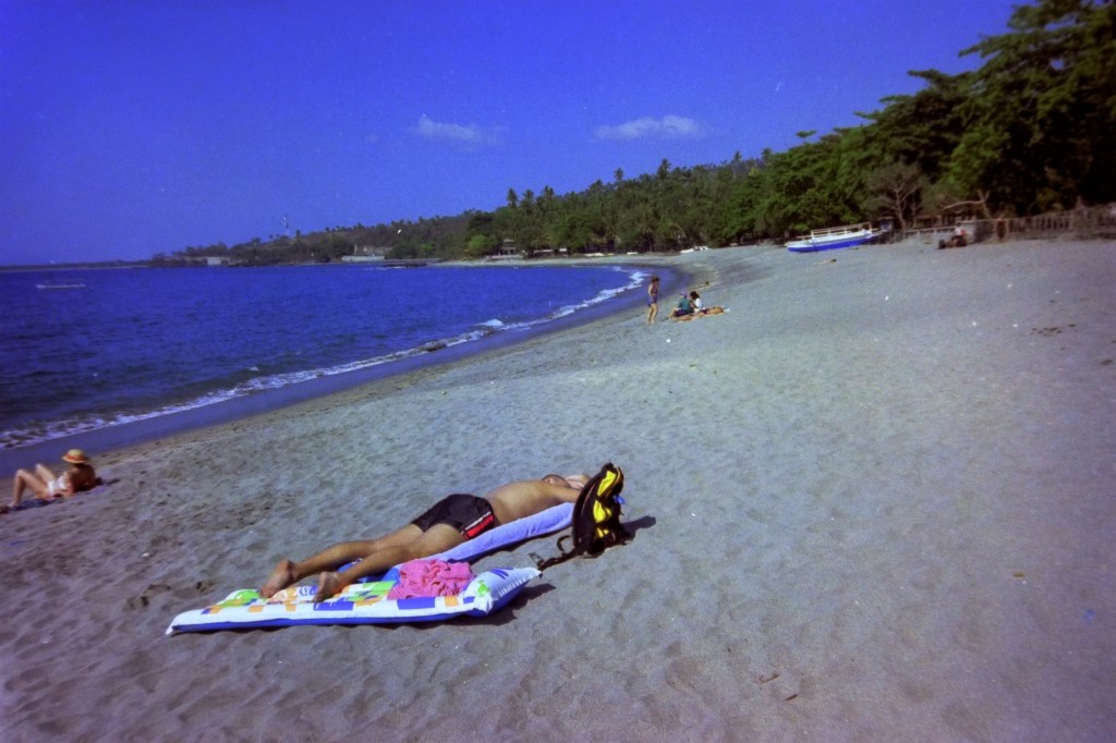 Arrived in Lombok yesterday evening at around 9 p.m. and were picked up by a minibus that took us to Sengigi Beach. Pleasantly surprised at how well everything worked out with bus, ferry and minibus, although it was only Ørjan and I who travelled with Perama. Another hazardous drive in the dark passing motorcycles, cyclists, pedestrians and horse carriages, seems they don’t have lights on anything or wear any kind of reflective clothing – just luck we didn’t hit anyone on the way here – we’re definitely not going to drive in the dark. Everything seemed strange and desolate, but when arriving in Sengigi there were a few tourists and some restaurants and bars along the way that were open. Looked for a place to stay, thought it was a bit expensive at Dharma, so went along with someone to look at another cheaper place in the middle of the bush, but decided to go back to Dharma when we saw the horrible rooms and the people who stayed at the other place – obviously under the influence of something. We got a bungalow at Dharma almost at the beach for 45,000, with an open-air shower/toilet – very nice. The receptionist suggested we’d give our valuables to him for safekeeping – he would hide them under his pillow… Originally, he said yes when we asked if there was a safe deposit box in the bungalow, seems they nod and say yes when they don’t understand the question. Slept quite well, and woke up to a “great” breakfast; two small bananas and a cup of tea… Well, enough to keep us going for a couple of hours… We have also switched rooms – only paying 35,000 for this one. Feels so nice to be here, as if we’re in a cottage, just the sound of nature around us; a grasshopper singing and the waves breaking. Wrote some letters sitting at our balcony this afternoon overlooking the ocean, the palm trees and the sun and just enjoyed the feeling of having time off, I really feel I’m on vacation now. We went to the beach, were swimming, sunbathing and just having a great time. Pity there’s some garbage from the ocean at the beach, but otherwise it’s just lovely. Wasn’t in the sun for a long time, but managed to get sunburnt on a few spots anyway – have to be more careful tomorrow. Did some shopping at a supermarket nearby, pot noodles which we boiled in water – quite nice, and very cheap. Had a meal later at one of the near empty restaurants – not many tourists around. Spoke to some Germans who live next door, they’d been to Gili Air, expensive and not any nice places to stay they said, but we’ll probably go anyway. Have picked up some leaflets describing boat trips that we might book. Ørjan wants to go to an island with big lizzards, apparently four metres long and weighing 130 kilos, but still not dangerous! (?) It’s past 10 p.m., and time for bed. Feel so relaxed now – it’s so nice after having been travelling all of last week, nice to calm down a bit. The thought of having more than three months off is wonderful!