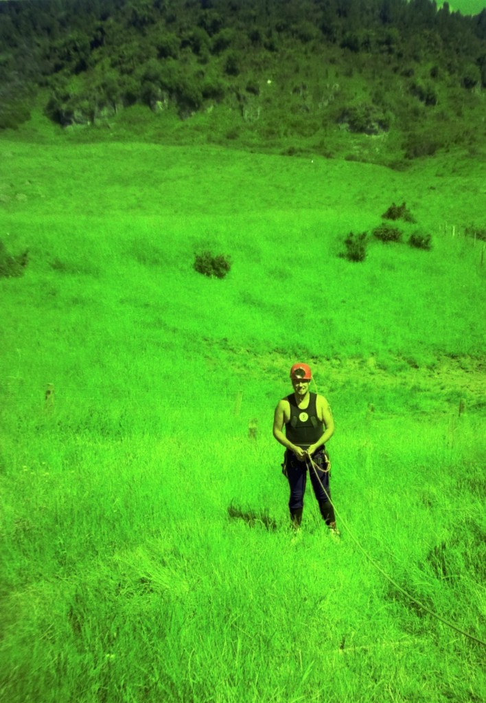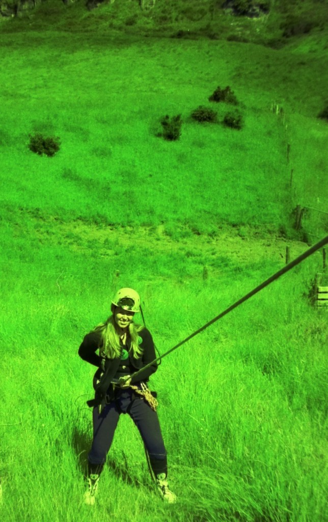 Tanja’s birthday! It is a long time since I have been this excited about anything, and nervous! I have looked forward to this for a long time. We started our adventure by donning wetsuits with purple tights and white gumboots. We got helmets with lights attached to them. There were 12 people including us. We drove with a minibus to the cave entrance. Here we got to choose an inflated inner tire tube and we got to try and jump backward into a small creek. The entrance to the cave was tight and after a while of climbing and crawling we did a new backwards jump with the inflated tube held firmly to our bottoms into a large underground lake. Inside the cave it was pitch black darkness and we floated down a subterranean river. We all held on to each other and formed a long chain of rubberized humans. The most amazing thing happened when we all switched off our headlamps and we were plunged into total darkness. At first, I thought we say daylight but when we came closer it was millions of glow worms hanging from the roof of the cave! It was like floating in space and the glow worms above were the stars, it was one of the most amazing moments of my life. All was quiet, it was like all of us held our breaths just to savour the moment, it was otherworldly! At this point we were around 65 metres beneath the surface and the water was around 13 degrees, so my hands started to get a bit cold and also my feet. We walked a bit more and did another 5 metres backwards jump into a small pool. After climbing upwards, we ended up in daylight in the same creek where we had started a few hours earlier. Back at camp we got hot soup and bagels for lunch. We both thought that this experience was one of the best things we had ever done, so I decided to see if I could get a discount if we wanted to go with the advanced afternoon tour. Incredibly we got half price on that tour! Amazing! We had a 1-hour break before it was time to don the wetsuit and cave exploring attire. We also got harnesses for rappelling and an extra battery for our headlamp, this trip was a full 3 hours underground. We drove up to almost the same spot as earlier only a bit further up the hill. There was a brief introduction to rappelling.