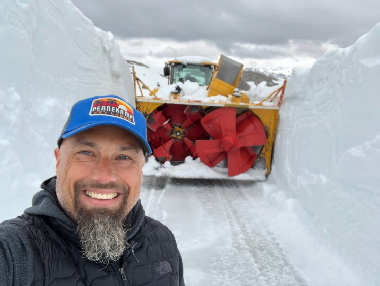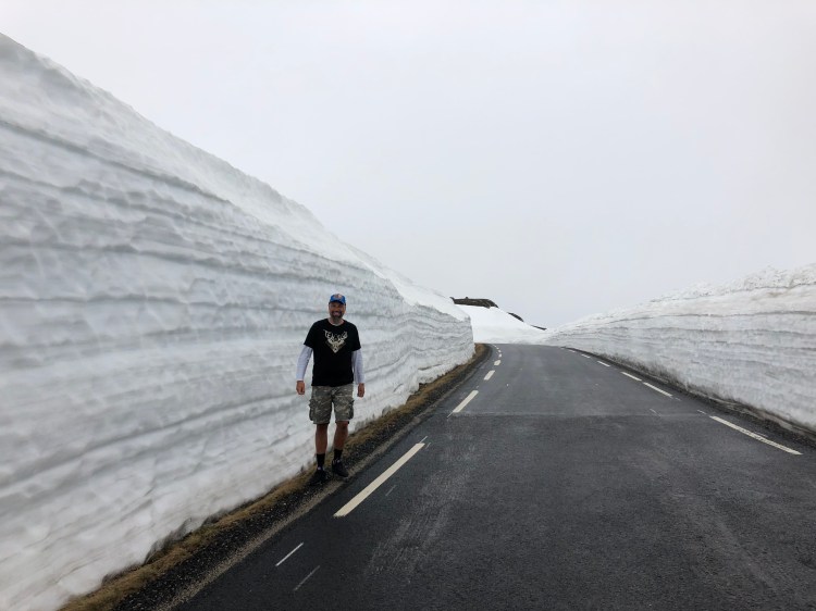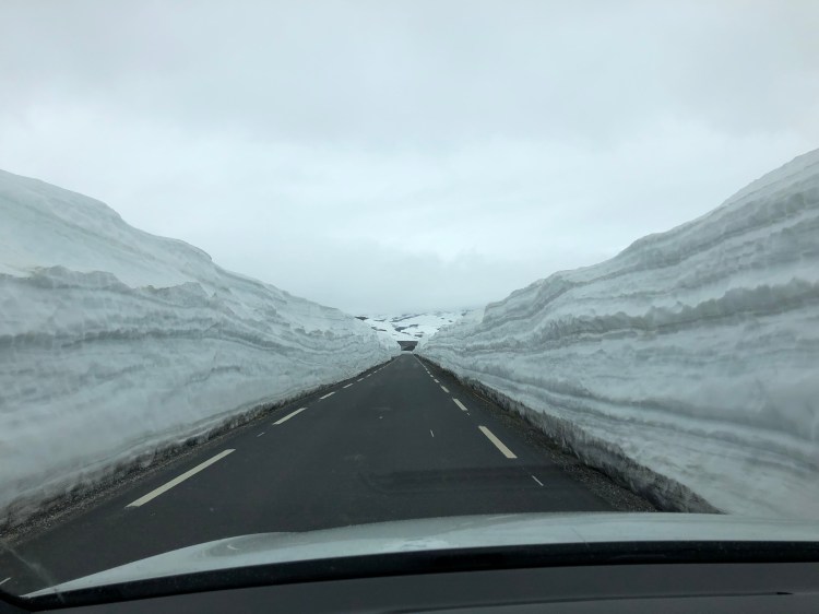 We did a sneaky detour, just as you start the decent there is a road to the left signed to Langavatn that will take you on a smaller road, we think we were the first to drive here for the season when we arrived, and clearing of the road was still going on when we passed. We almost got stuck at the end where there is a large parking area for hikers, summer tires and snow are a bad combo, we had a light scare but came out laughing. It was awesome to look at the dude clearing the road, it must have been a 20 foot drift he was chopping away at with what was a huge digger but it looked small compared to all the snow it was trying to remove.