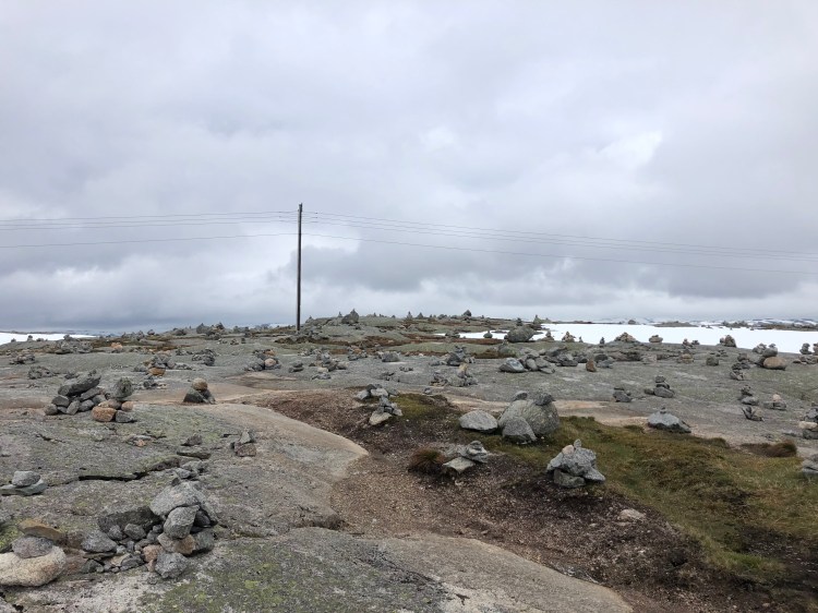 Before that you will cross another epic stretch of road, in our opinion even more spectacular than the road we just came from between Brokke and Suleskard. It has even more twists and turns, and it offers great vistas. At the peak of the route there is a field of small monoliths made by people passing by from all over the world, you will know that you are in the right spot when you see them all over, they are impossible to miss. Depending on when you cross the mountain, the amount of snow will fluctuate. When we arrived in the beginning of June, there was plenty of snow.