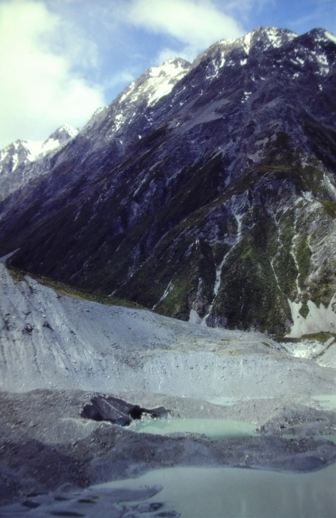Got back here at around 4 p.m. today and have got a double room, nice to share bed once in a while! Yesterday we were in a seven-bed dorm, ok with kitchen, toilet, shower and TV, but was cold last night and had to get up and put some more clothes on, stupid not to rent a duvet. Went for a two-hour walk towards a glacier yesterday, just Ørjan and me which was nice, could walk in our own pace. Nice and quiet, only the birds singing and the occasional rock-slide and small avalanches that broke the silence. Fresh, nice air and loads of beautiful lupins along the way. We were hungry when we got back, so had a “gourmet” meal with instant noodles back in the cabin. Exchanged some money today and got more for our USD than last time, NZD 327 for USD 200 (only 322 last time). We have around NZD 30 to spend per day, should try not to use Visa too much, need to have some money when we get back, too. Lousy weather today, grey and raining the whole day, slept almost all the way on the bus from Cooktown. Leave for Kaikoura tomorrow at 8.20 a.m.