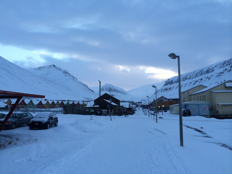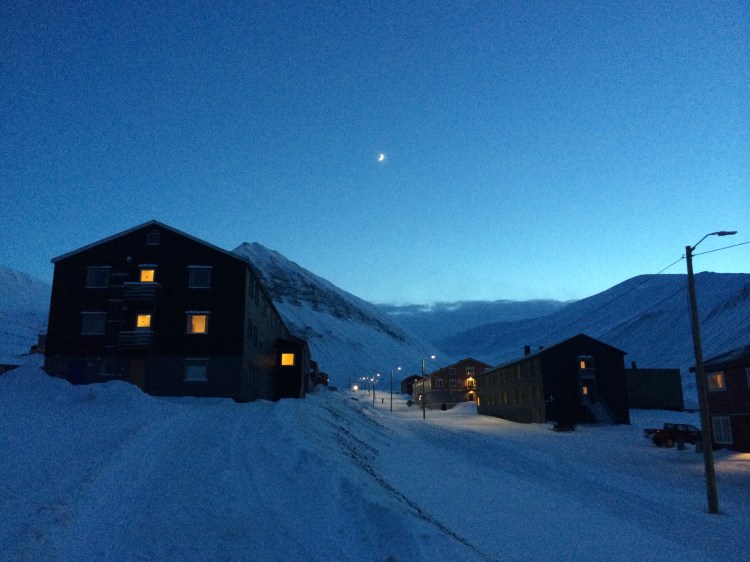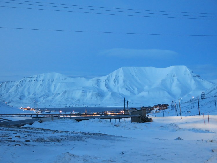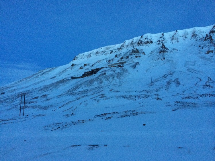 Arriving at the airport in Spitsbergen is like landing on a snow-clad planet Mars. The landscape is eerie due to lack of light in the early spring (our visit was in late February) and the crumbling mountains with their abandoned coal mines and lines of coal buckets suspended in mid-air surrounding the settlement of Longyearbyen.