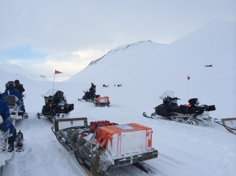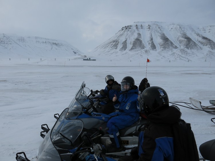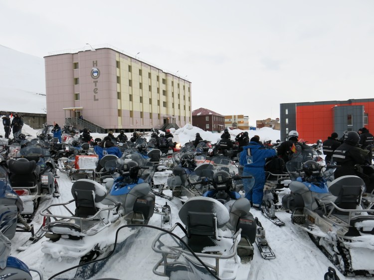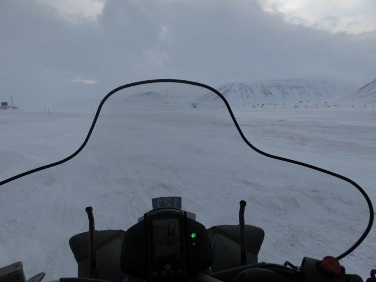 Our first full day was a snowmobile adventure from Longyearbyen to Barentsburg. We were all equipped with heavy duty romper suits, full face masks, helmets, and thick boots to survive the trip. It was freezing cold when we started early in the morning, and the temperature really did not change for the whole day. Freezing it was. Even the handles on our snowmobiles had heating elements, and we understood why during the day.