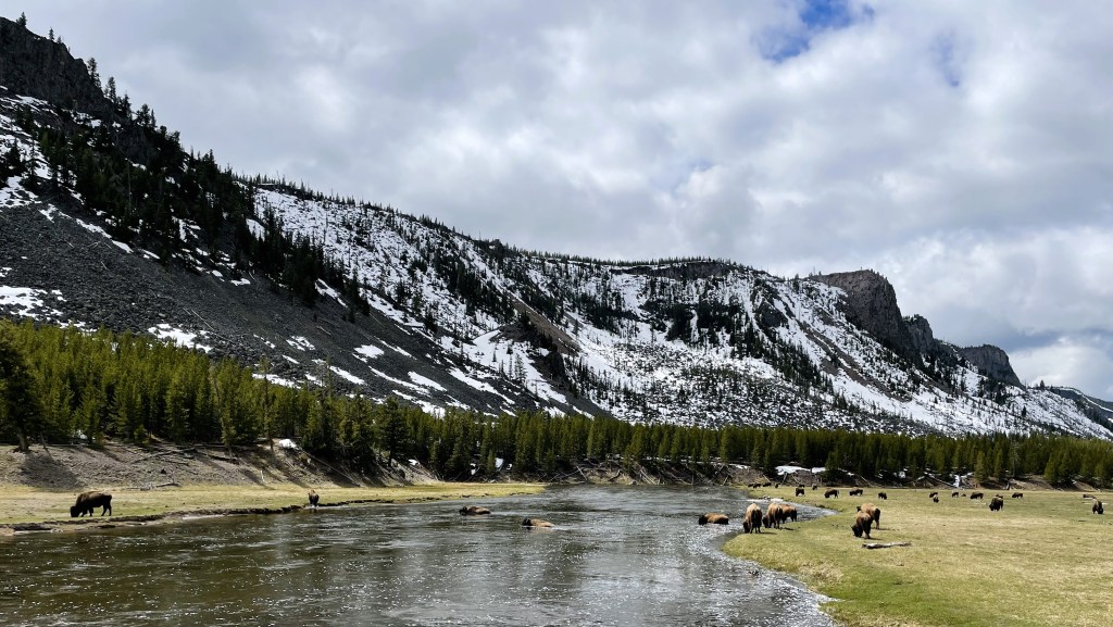 West across the Blacktail Deer Plateau, we saw more bison, a black bear was spotted along the road and we saw a huge grizzly in the distance. Our destination was Lamar Valley, it is reckoned as a good spot for watching wildlife, and it probably is but we were a little underwhelmed. After seeing so much bison along the roads and smaller valleys, Lamar Valley is a huge expanse and the many bison here we could only watch at a distance. The valley was cool but we felt like we could just as well have stayed at the western part of the park. It was still an epic drive across the valleys, plains and wide open expanses of the park, do not get us wrong here, there are spectacular landscapes all along any road of the park.