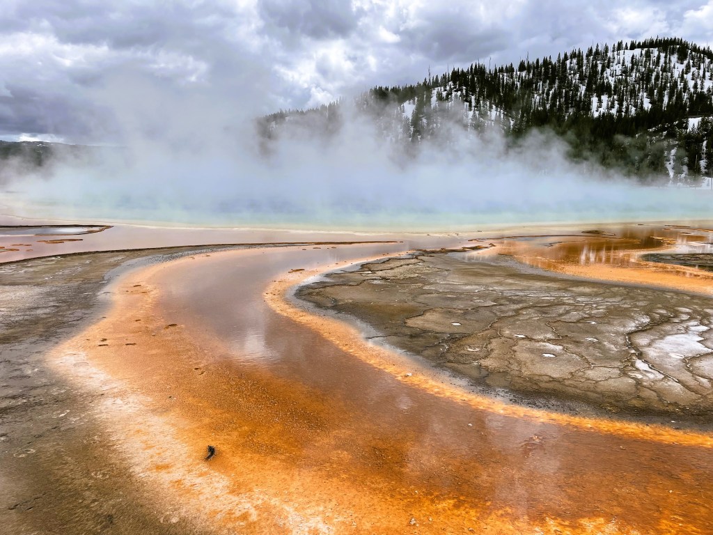It was also a grand sight to come around the corner of a bend and see a full herd of bison and calves grazing on the river plain in front of us. The geyser basins down the road were awesome. The most spectacular was Grand Prismatic Spring without a doubt, very cool to walk the walkways around the pool itself. There is a walk to elevated ground on the knoll behind the pool but that was closed due to snow when we visited, it is the most awesome place to see the colours of the pool from, and where most photos of the spring is taken.