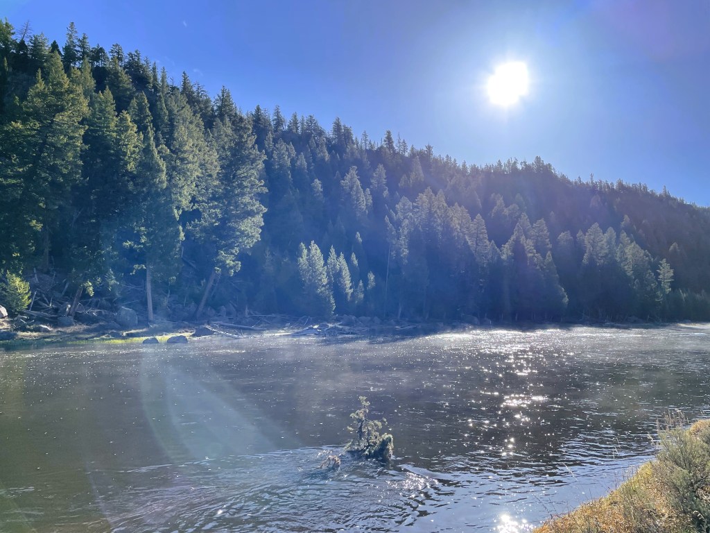 After picking up our lunches at Ernie’s at 7am we drove back into the park. And we quickly learned that if you encounter a sudden line of cars stopping in the middle or side of the road, there is wildlife somewhere in the vicinity. We encountered such a line of cars, and sure enough, there were a couple of wolves jogging along the river at the other side.