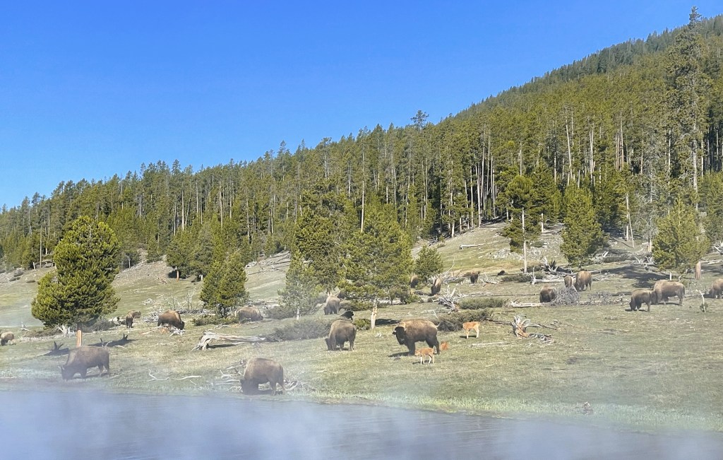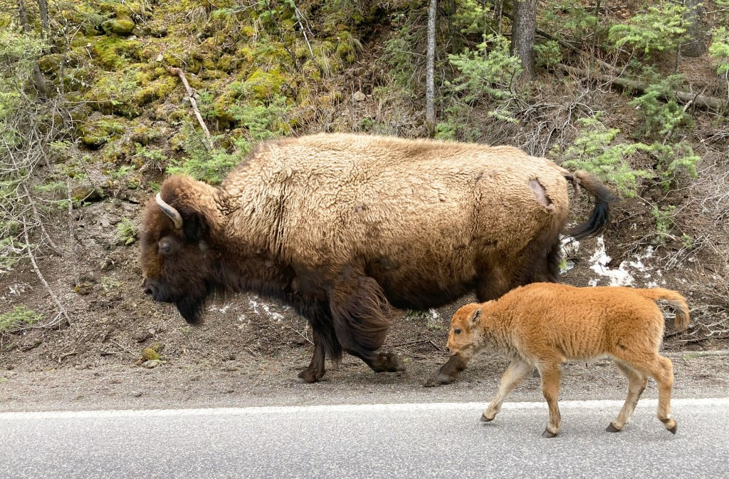 We headed north at the first major crossroad, encountering another herd of bison relaxing on the hot ground of a nearby hot pool system. Mom nearly got run over by a young calf who wanted to cross the pathway.