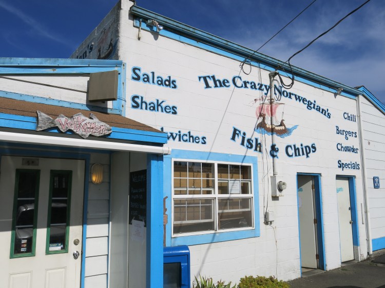 In Port Orford, look out at the south edge of town for The Crazy Norwegians Fish and Chips shop, stop there for great local fish and chips, and buy the bumper sticker “In Cod We Trust”. Continue along the coast to Brookings. Why Brookings? Again, it seemed like we needed somewhere to stop and sleep, so we chose Brookings. The Spindrift Motor Inn was not bad, not great, but a room and a shower. Had one of the most epic sunsets in my life there.