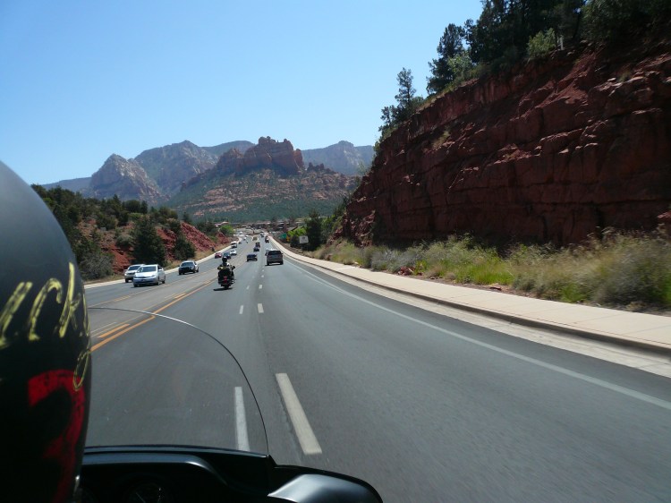 Heading out on the road again there is a spectacular highway out of Sedona and north. You see it in the intro video for Sedona, the 89a north towards Flagstaff starts off into Oak Creek Canyon. It is stunning riding. When the canyon ends, there is no other way than up. Through a series of switchbacks, the road winds itself up on the desert plateau. At the top there is a lookout over the canyon on the right hand side, and the stop here is a must, just to see the road you just came up.