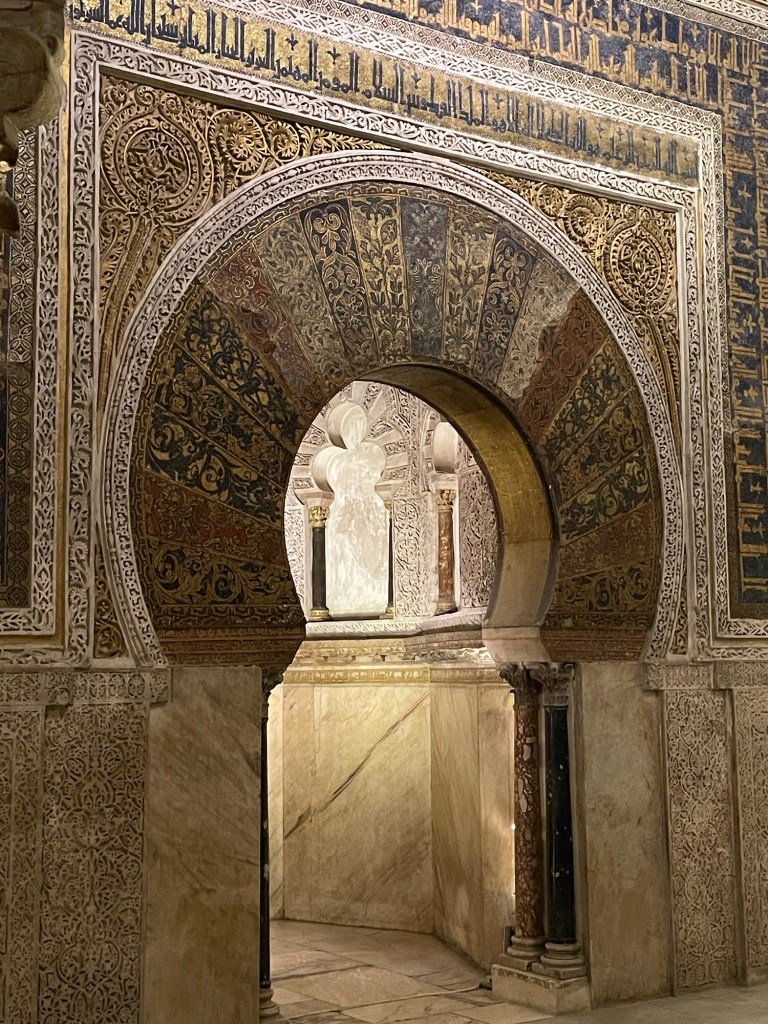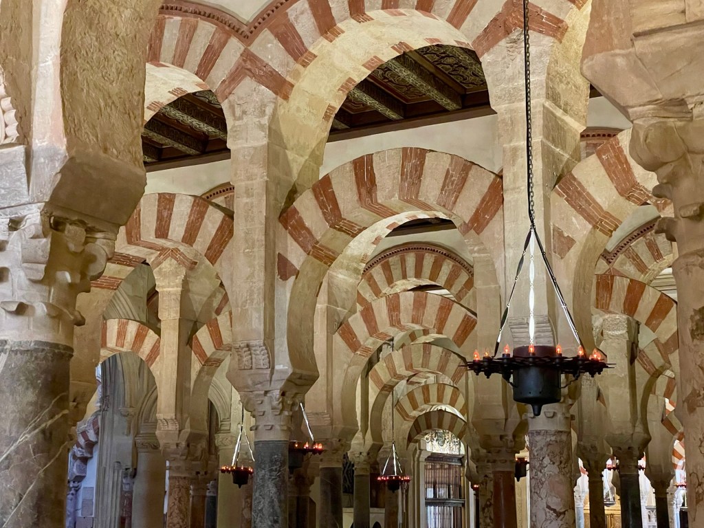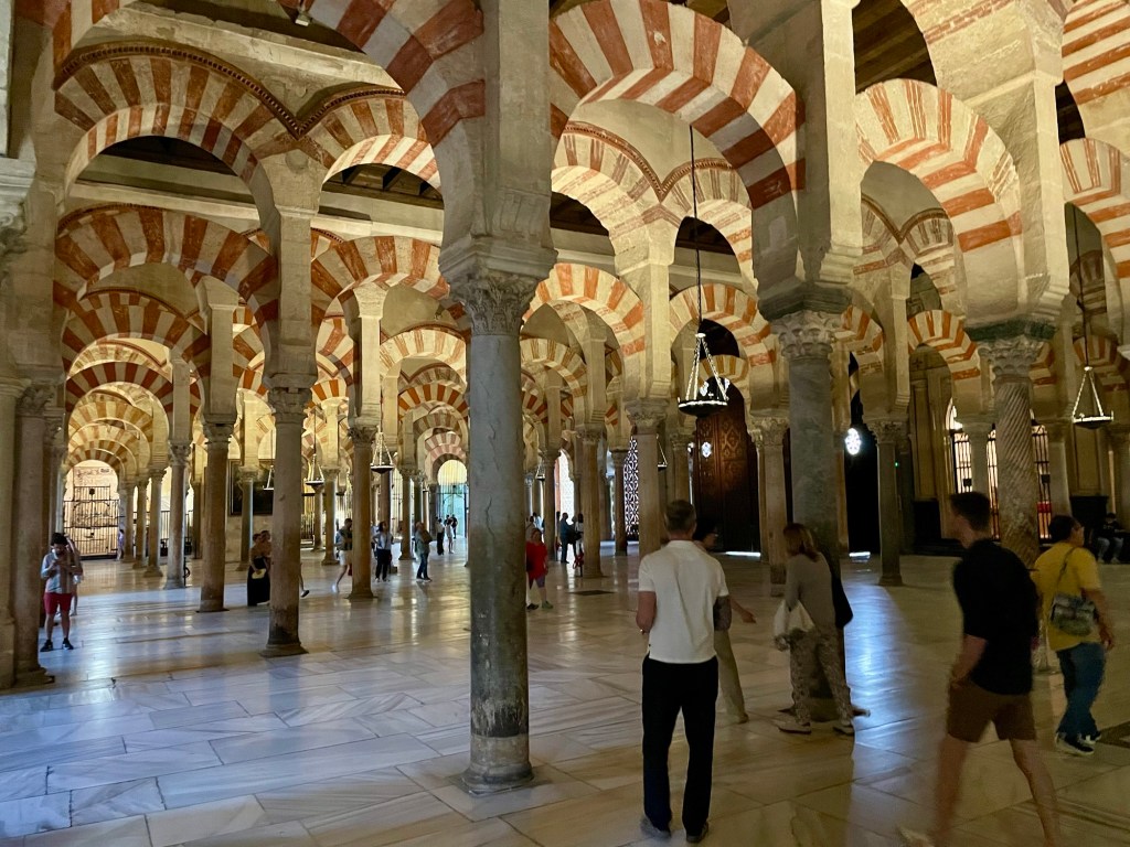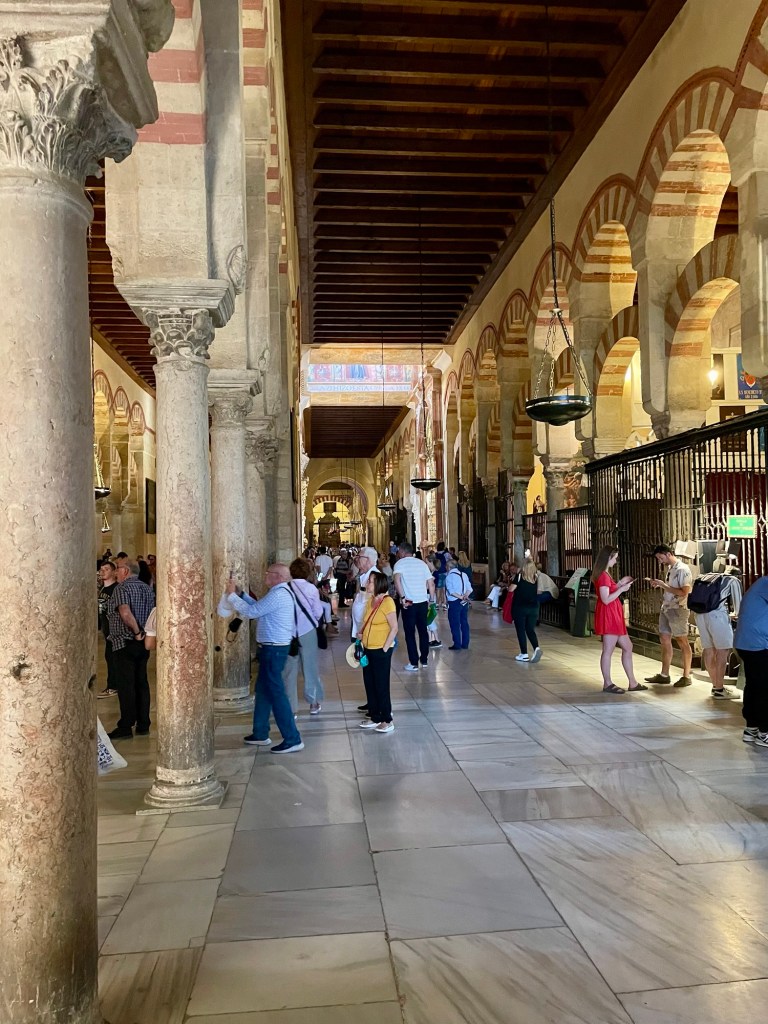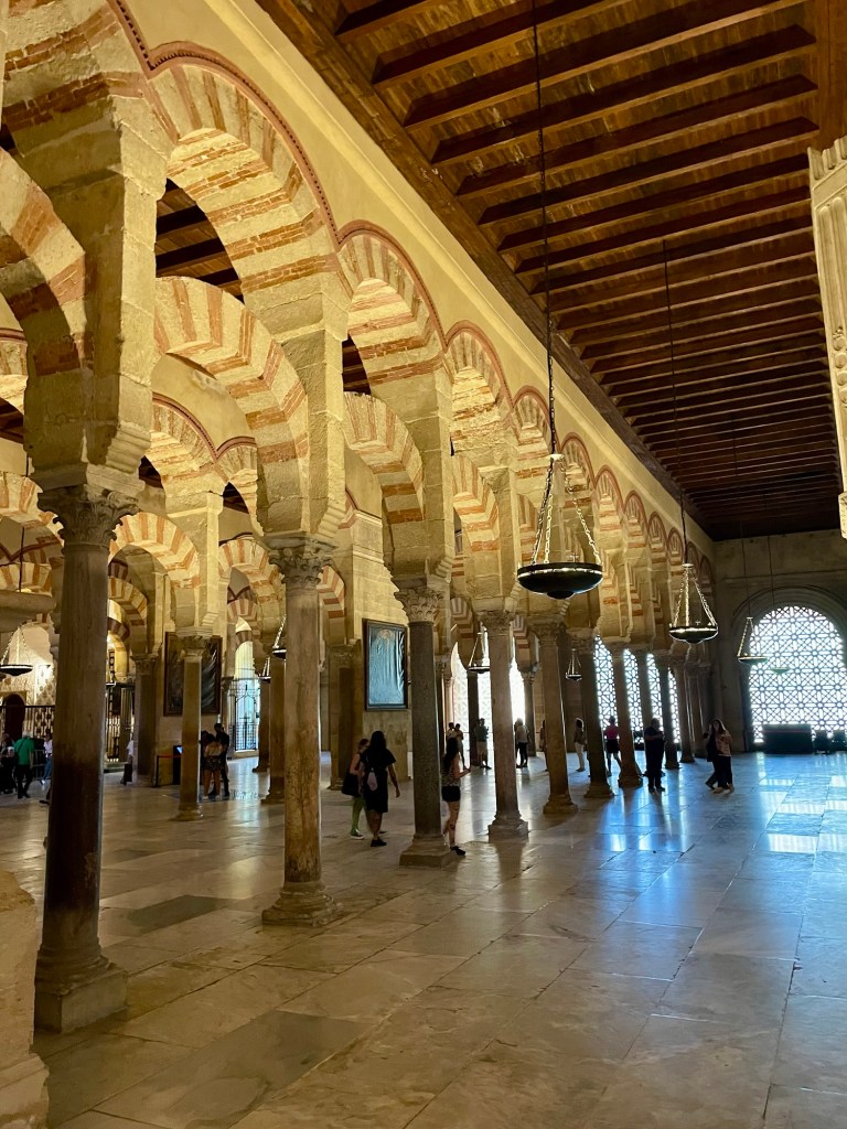 The interior of the mosque-cathedral is famous for its vast hall with rows of double arches, supported by columns made of jasper, marble, and other materials repurposed from Roman and Visigothic buildings.