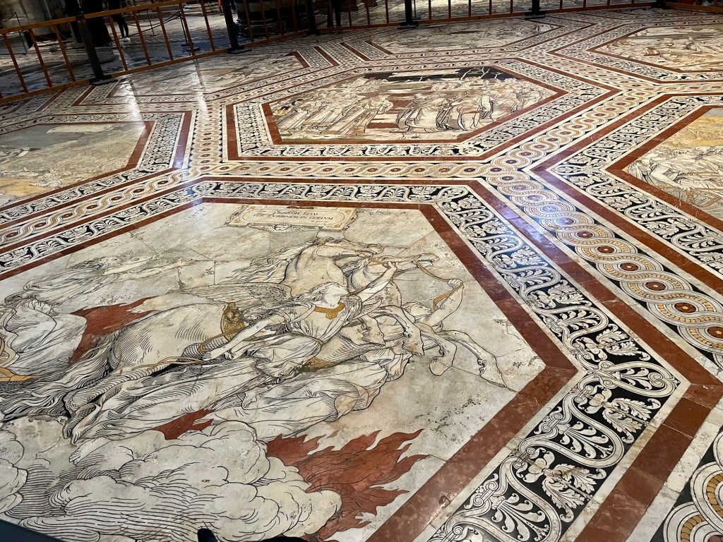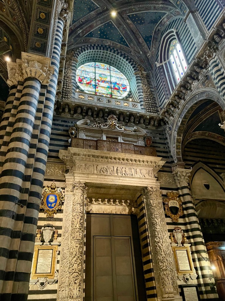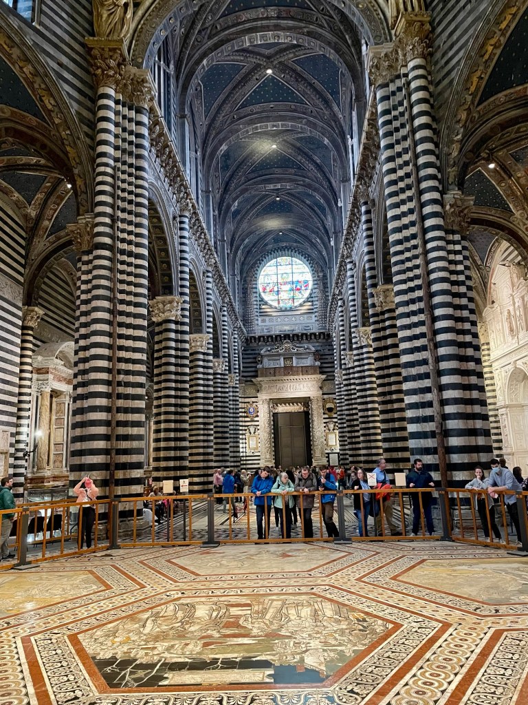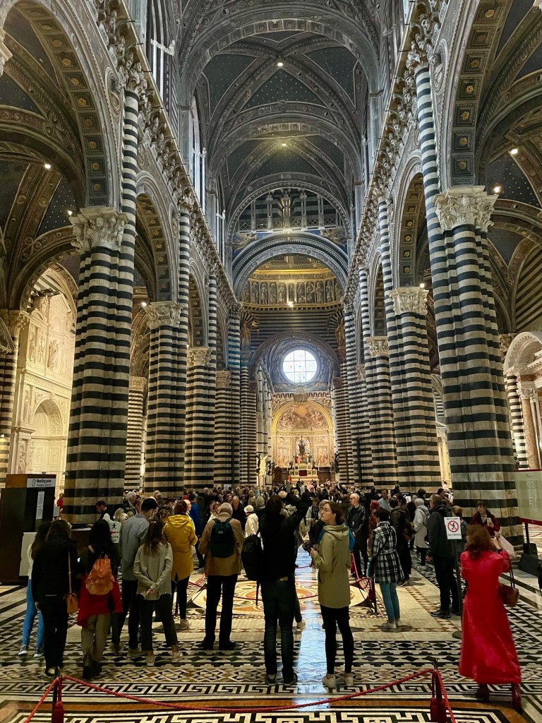 A masterpiece of Italian Gothic architecture featuring intricate black and white marble facades. We lined up for tickets in the pouring rain, probably why the line was short. And we should have pre-bought tickets but we did not this time and paid the price by being soaked! The interior houses works by Michelangelo, Donatello, and Bernini. We have been to many great and awesome cathedrals, like Cordoba and Seville but Siena was very different due to the black and white «stripes» on all pillars and interior. The floor is covered in reliefs and the side chapels were sumptuous. Very crowded, and that was expected but perhaps even more so since it was raining heavily outside.
