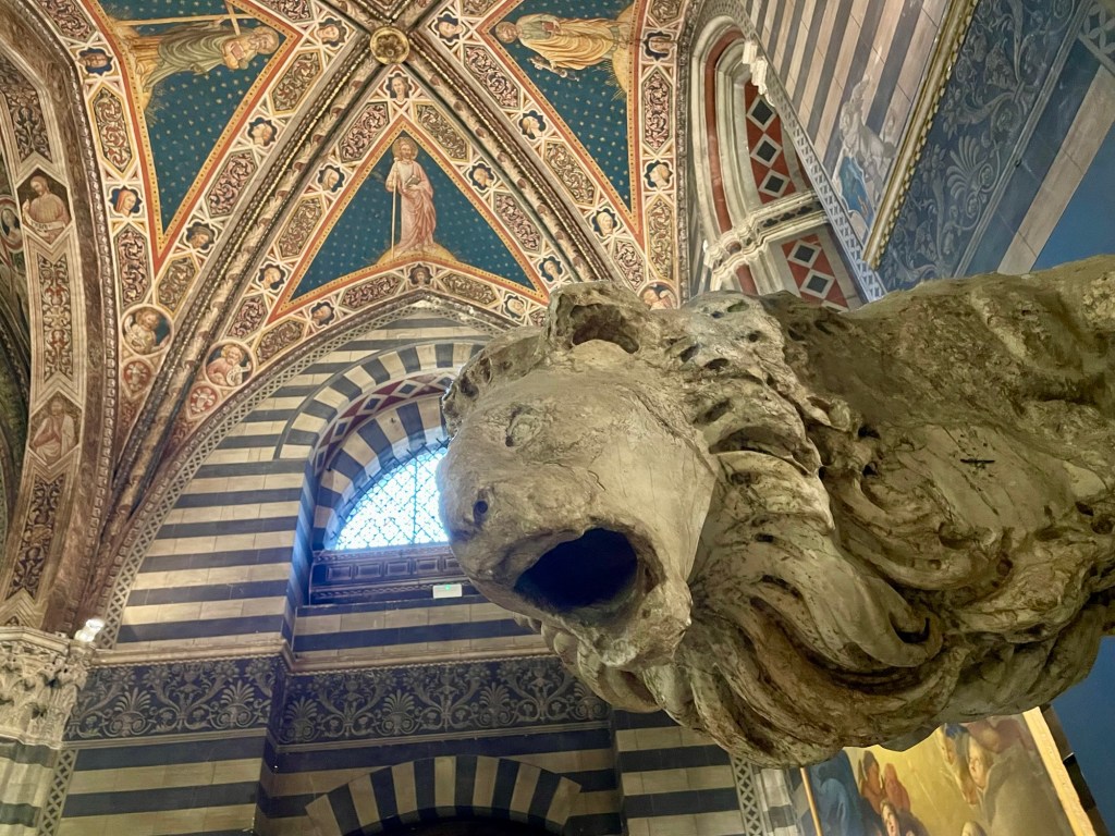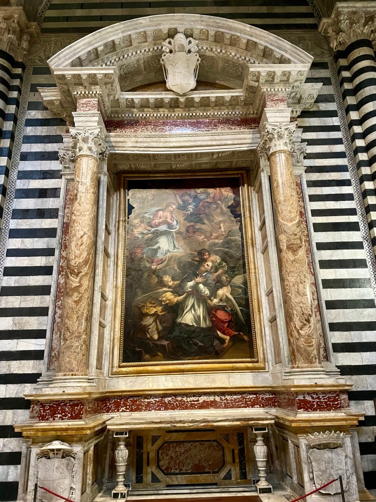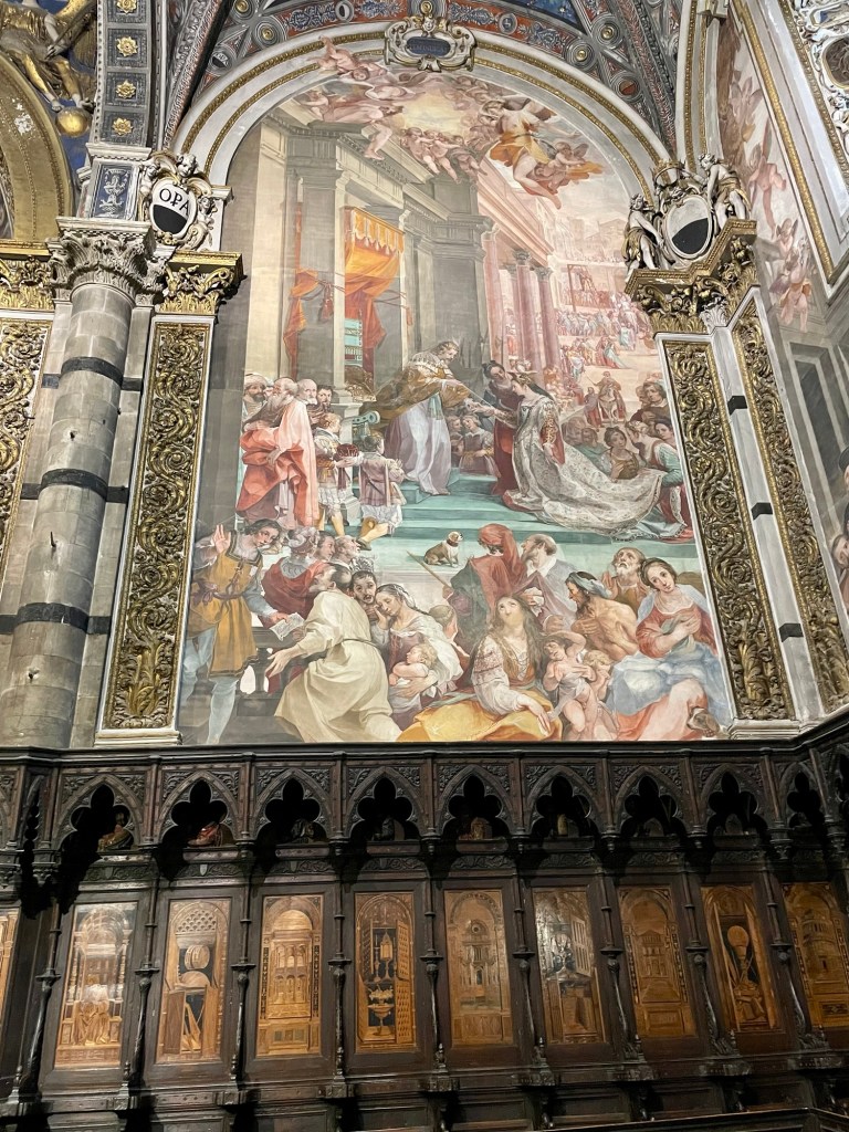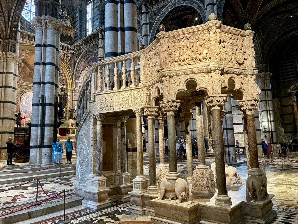 A masterpiece of Italian Gothic architecture featuring intricate black and white marble facades. We lined up for tickets in the pouring rain, probably why the line was short. And we should have pre-bought tickets but we did not this time and paid the price by being soaked! The interior houses works by Michelangelo, Donatello, and Bernini. We have been to many great and awesome cathedrals, like Cordoba and Seville but Siena was very different due to the black and white «stripes» on all pillars and interior. The floor is covered in reliefs and the side chapels were sumptuous. Very crowded, and that was expected but perhaps even more so since it was raining heavily outside.