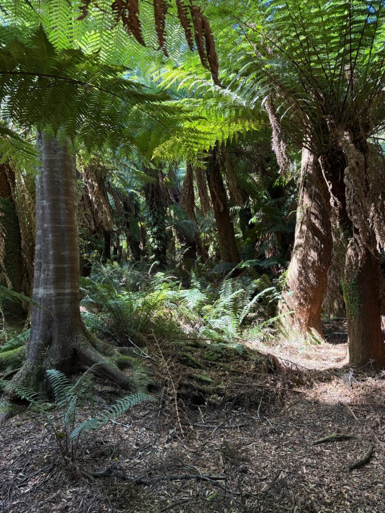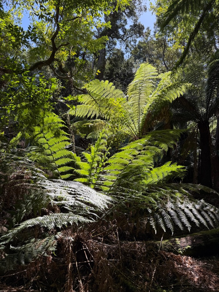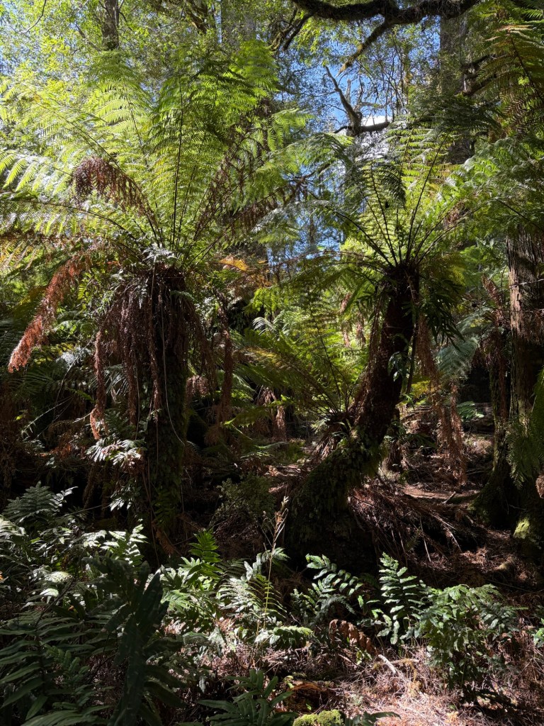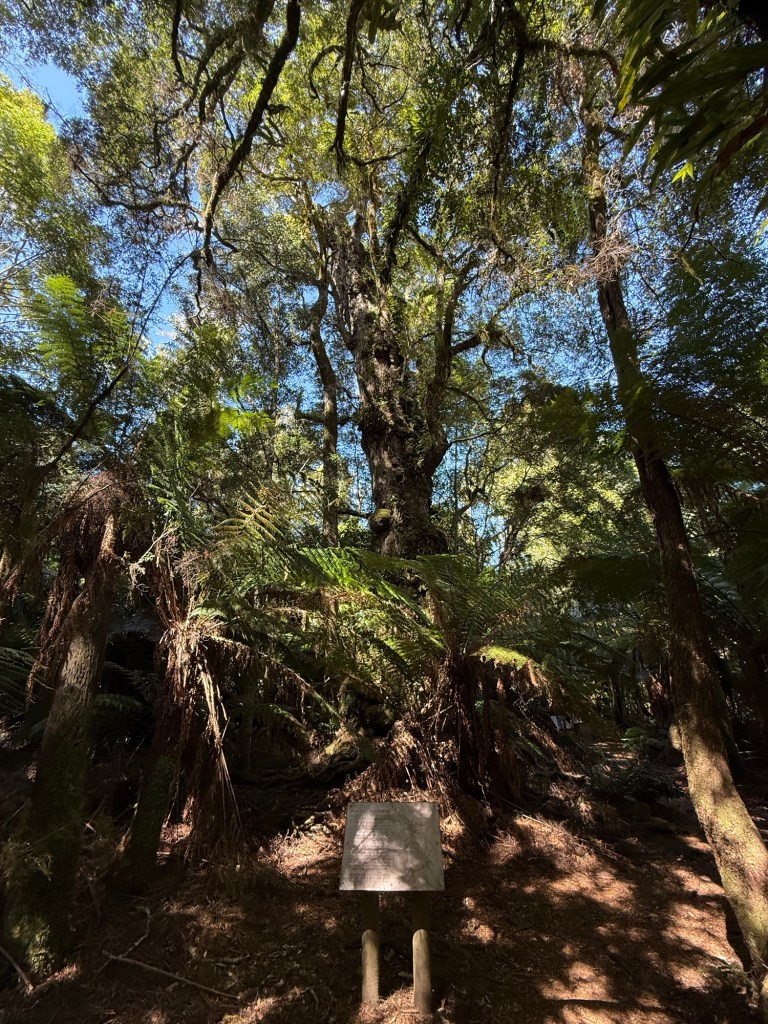 The path winds through lush ancient rainforest with myrtle beech, towering tree ferns and smaller ferns and trees with hanging moss. It is really an enchanted walk. Storyboards (slightly faded) tells the story of the forest and land through the character «Grandma Myrtle» weaving tales of continental drift and fern evolution.