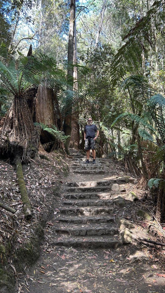 At the bottom of the falls you can choose to either walk back to the visitor centre via the other side of the creek, or continue up the many stairs up to the top of Russel Falls to see the nice but not so spectacular Horseshoe Falls. It is a 10-15 minute extra hike one way but well worth the sweat from all the stairs. We continued from Horseshoe Falls to the cool Tall Trees Walk.