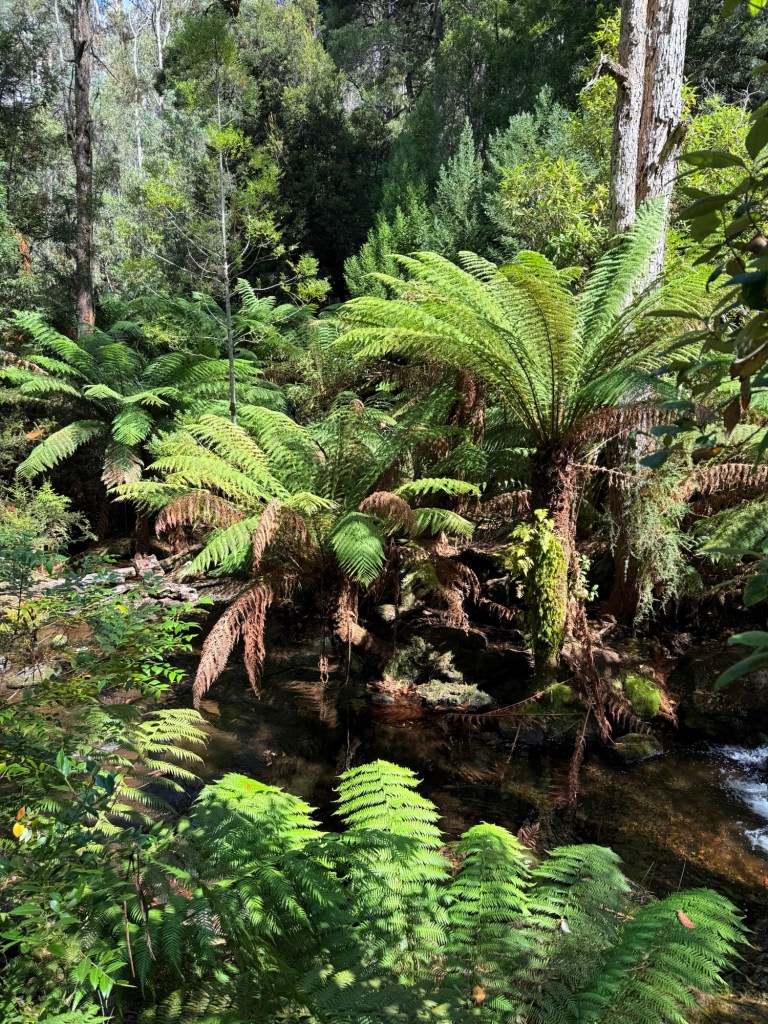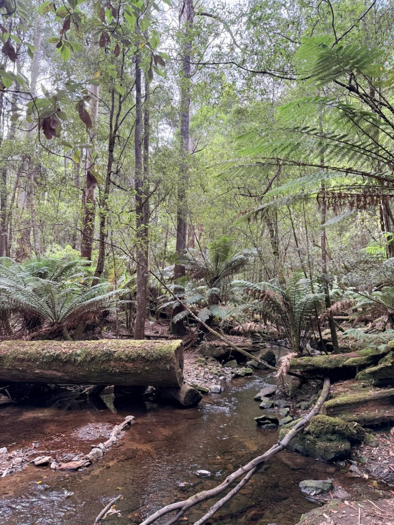 The trail winds under towering swamp gums—the tallest flowering trees on Earth—alongside native understoreys of dogwood, musk, and myrtle, with vivid moss and fungi all along the creek that runs beside the trail. The large tree ferns makes this a magical place.
