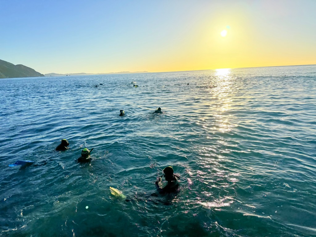 Within minutes we were surrounded by hundreds of bottlenose dolphins, frolicking in the sunrise. It was a breathtaking sight. All around us, dolphins leapt, spun, and seemed to be having just as much fun as we were. Our boat moved ahead of the pod, and with a splash, we were in the water.