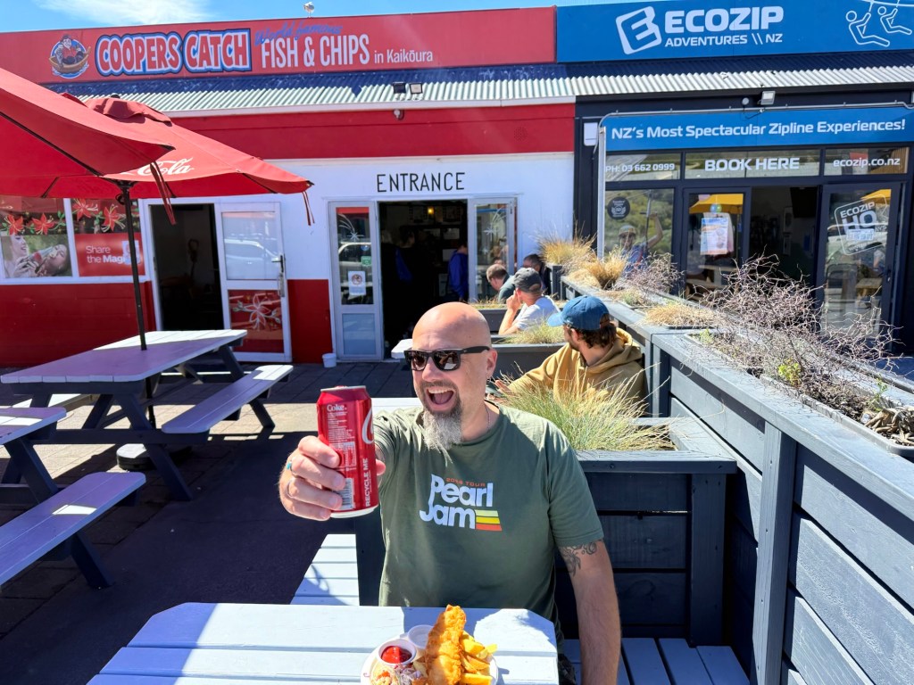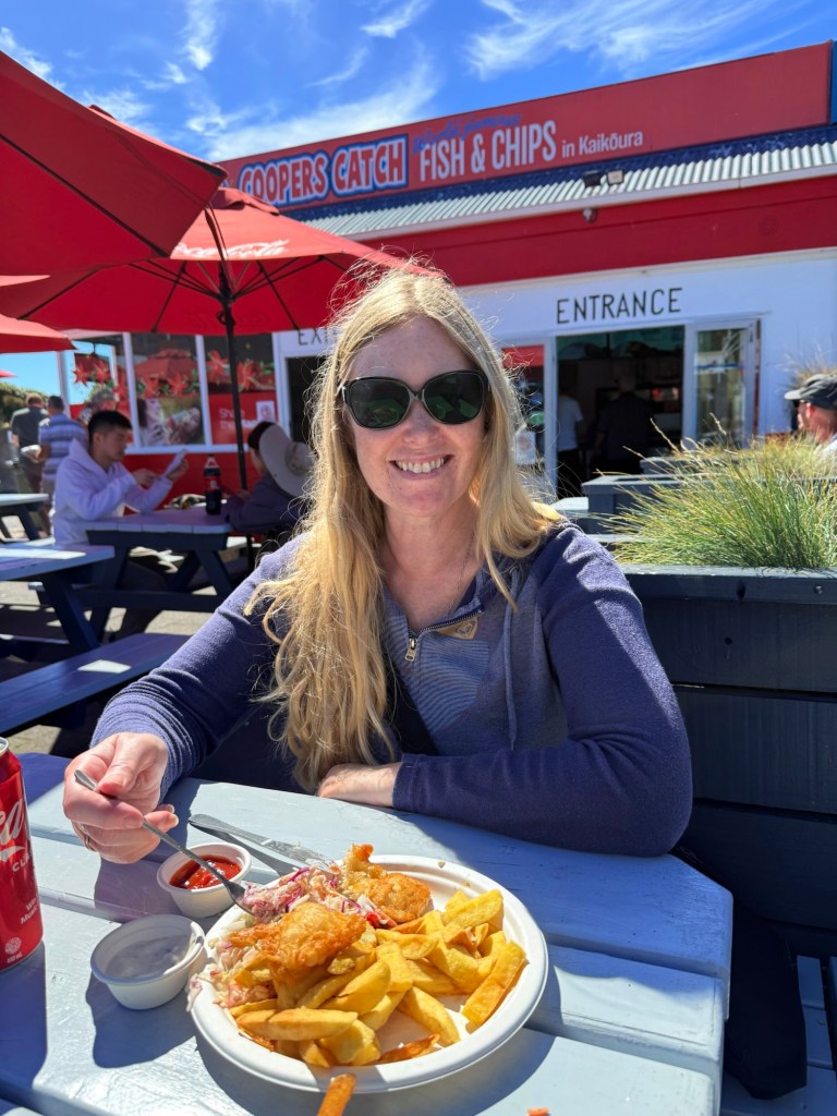 Back at Dolphin Encounter HQ, we returned our gear, thanked the crew, and sat down for a brilliant breakfast in the Encounter Café—the perfect ending to our perfect morning in Kaikoura. We walked back to our motel to shower, and spent a few hours looking around Kaikoura with its spectacular backdrop of snow clad mountains.