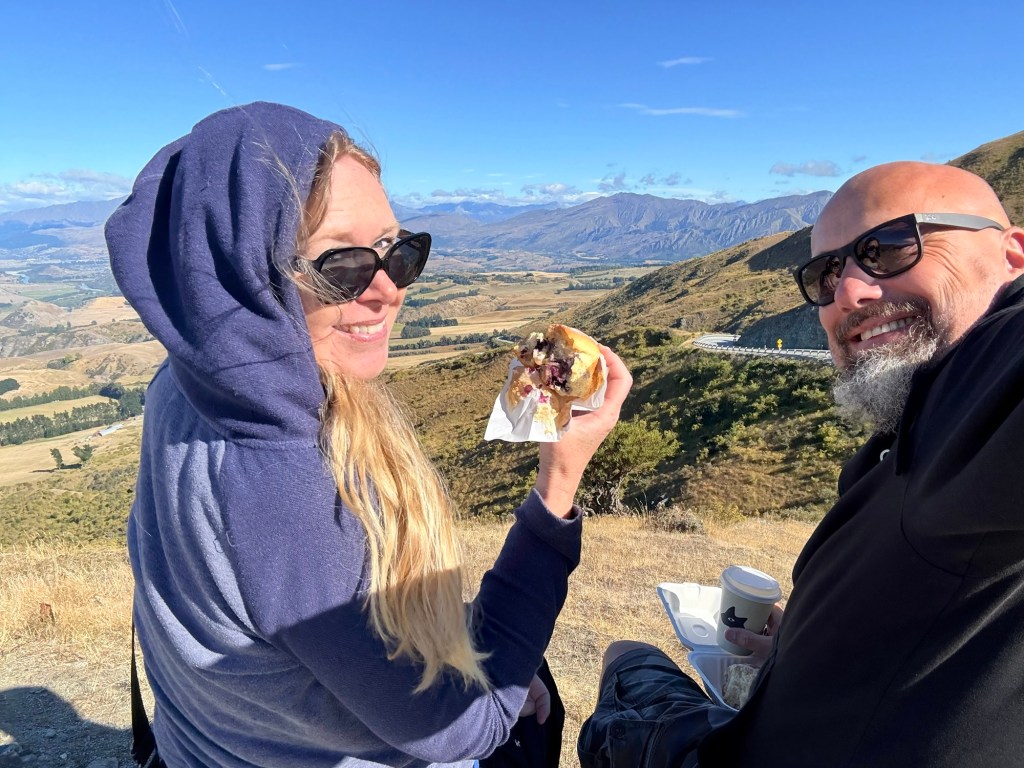 We stopped at the Crown Range Road Scenic Lookout for an alfresco breakfast in the chilly wind — not the warmest meal, but definitely one with a view!