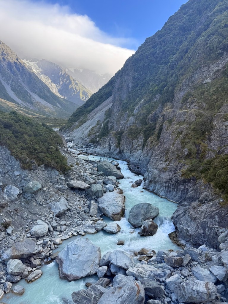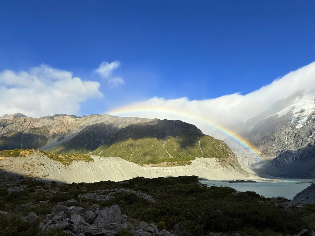 The weather was slightly against us — Mount Cook was shrouded in clouds — and though we were a little disappointed, we pushed on up the amazing valley. Disappointed is maybe wrong to say, it was magical looking at the clouds covering and uncovering the mountains like huge blankets being dragged across them. We also had a plethora of rainbows popping up at different times of our hike.