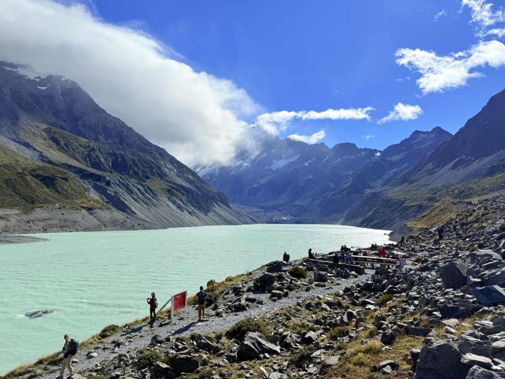 Mount Cook still refused to show itself, and we saw many people turning back toward the trailhead. We decided to wait it out for a while, eating lunch at the huge picnic table overlooking the lake and chatting with fellow travellers as we hoped for a glimpse of the peak.