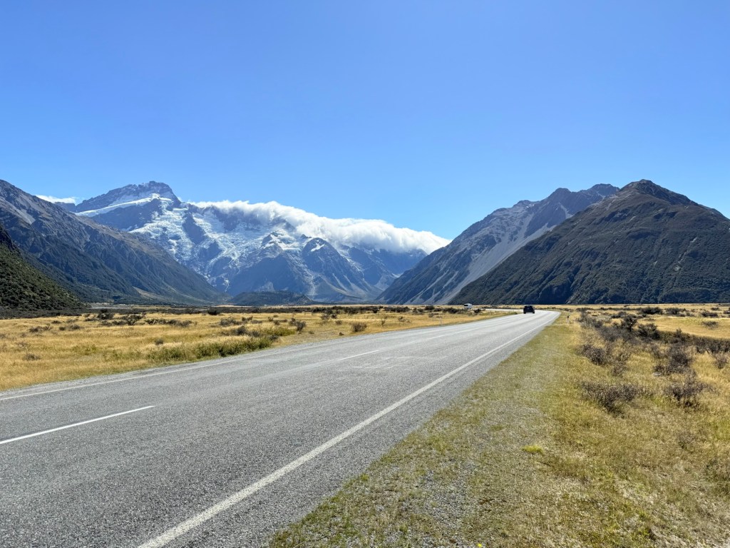 From Twizel, it’s a 50-minute drive — and what a spectacular drive it is — to the Mount Cook / Hooker Valley Track car park at the trailhead. The road takes you alongside Lake Pukaki, with Mount Cook towering in the background, growing bigger and bigger as you approach.