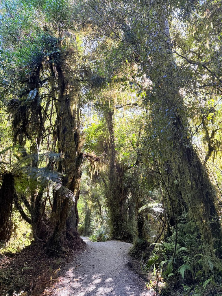 A little further along, the first suspension bridge offers breathtaking views both up and down the Hokitika River. The milky-blue hue comes from fine rock sediments, or “glacial flour,” carried downstream from the glaciers high in the Alps.