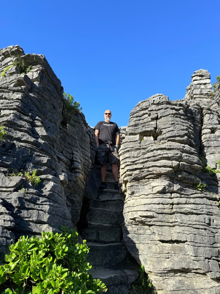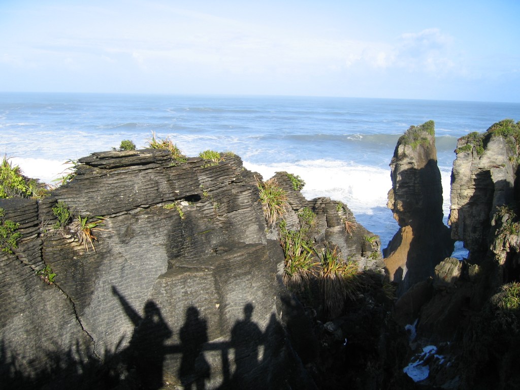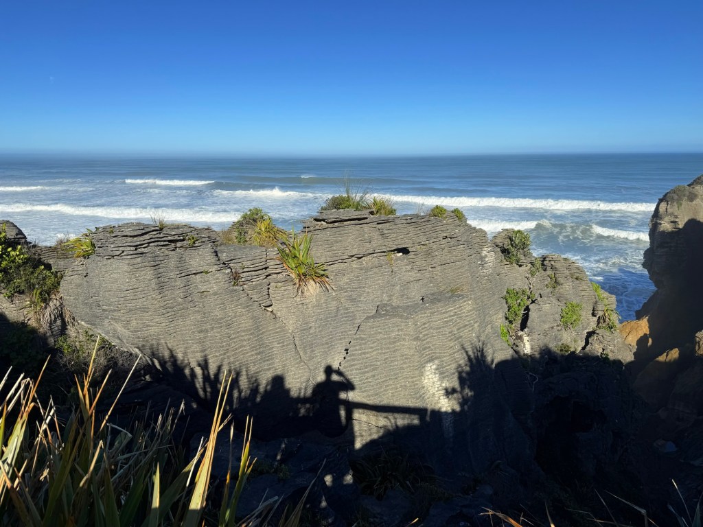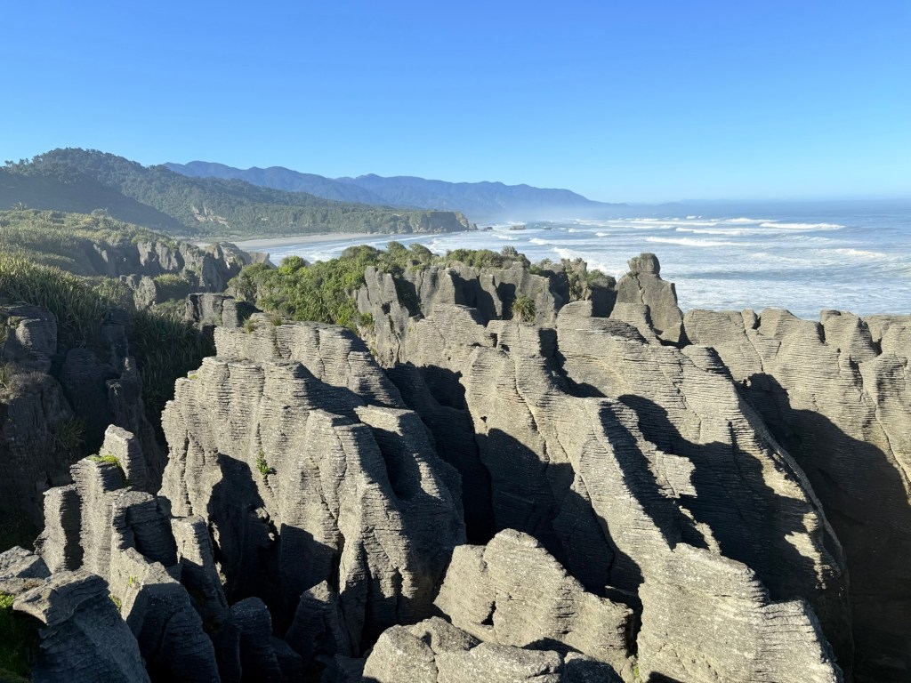 The Pancake Rocks are limestone formations eroded into a stacked, layered appearance—like piles of pancakes. This unusual pattern comes from a process called layered limestone accretion, where the remains of marine organisms were compressed over millions of years and later uplifted and sculpted by wind, rain, and waves. The sight is just as awe-inspiring as the first time we saw it, with the formations perched dramatically on the edge of the wild Tasman Sea.