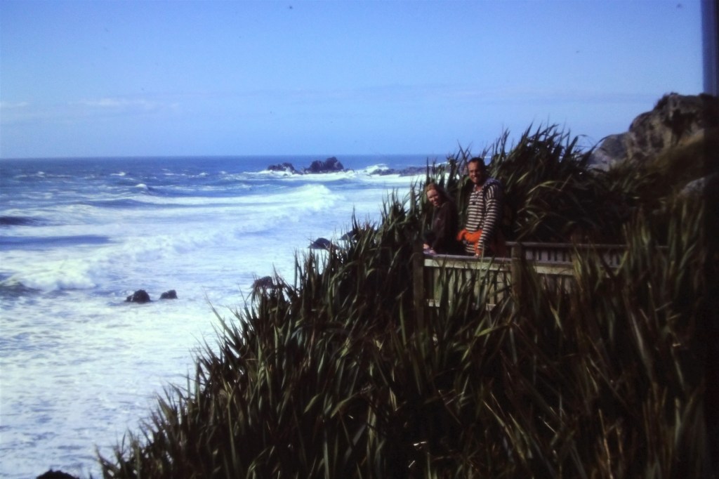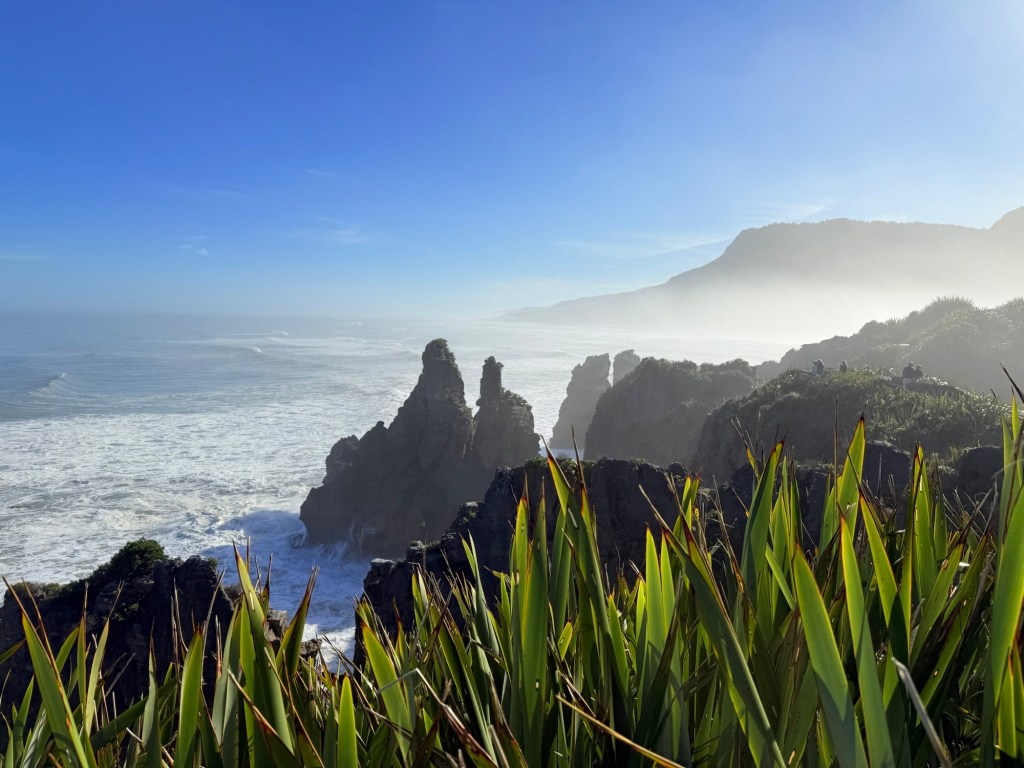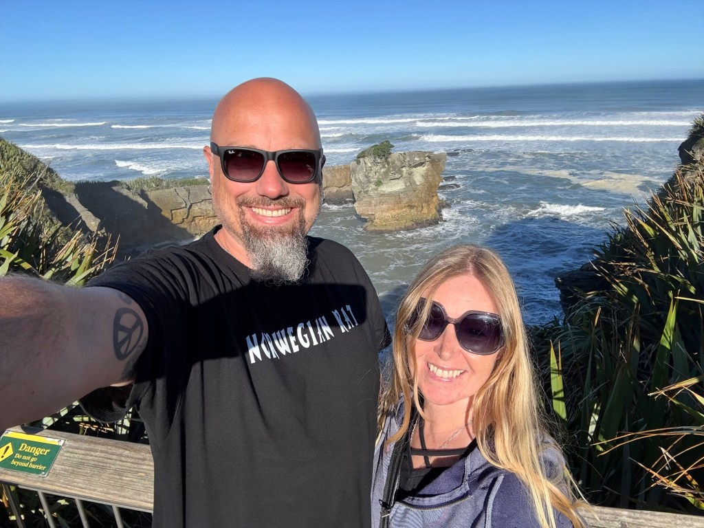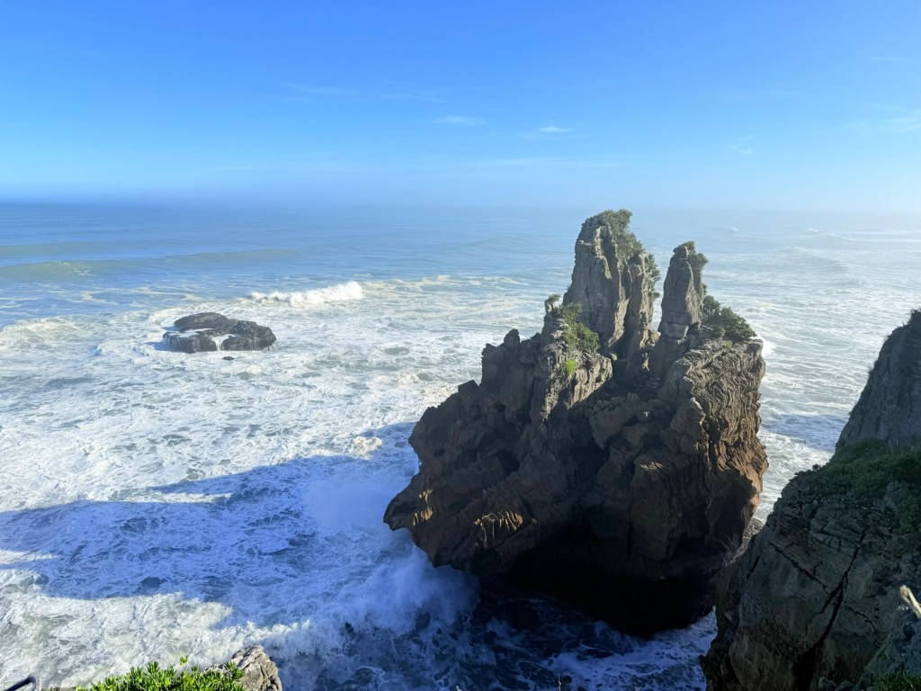 The Pancake Rocks and Blowholes Walk is a short, fully paved loop track (about 20–30 minutes) that winds through native forest and along the rocky coastline, with multiple viewing platforms along the way. It’s one of New Zealand’s most accessible iconic attractions. We had almost the whole place to ourselves since we visited around 8 a.m.—we’re sure it gets much busier once the tour buses arrive. Standing in the wind and feeling the raw power of the Tasman Sea is something special.