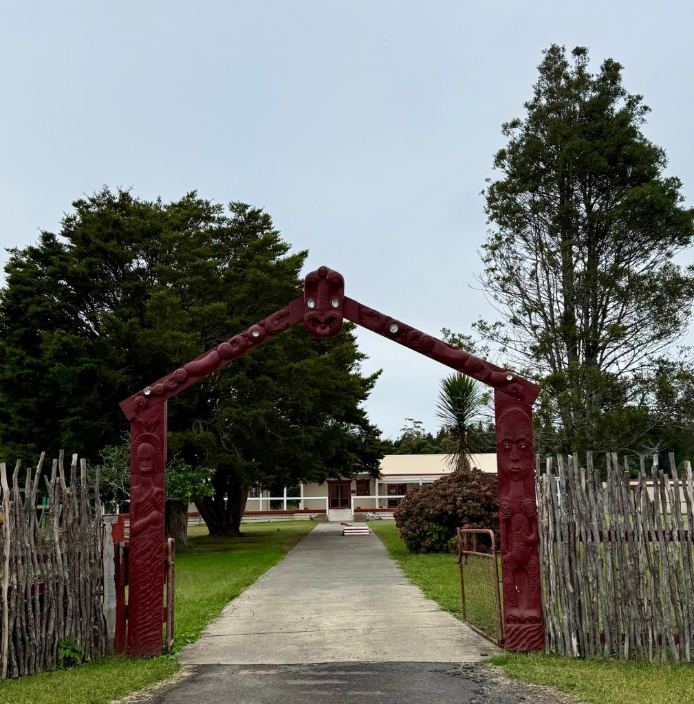From the lookout, the road drops steeply down the mountain along a winding, narrow gravel track toward Kennedy Bay. On the way, we passed the entrance to a local marae, painted red and decorated with traditional Māori carvings.