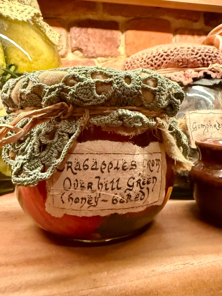 The fireplace was roaring, the rooms beautifully furnished, and in the kitchen small jars of preserved food had tiny labels noting the contents—and even stating that they were “harvested under a full moon.” Amazing.