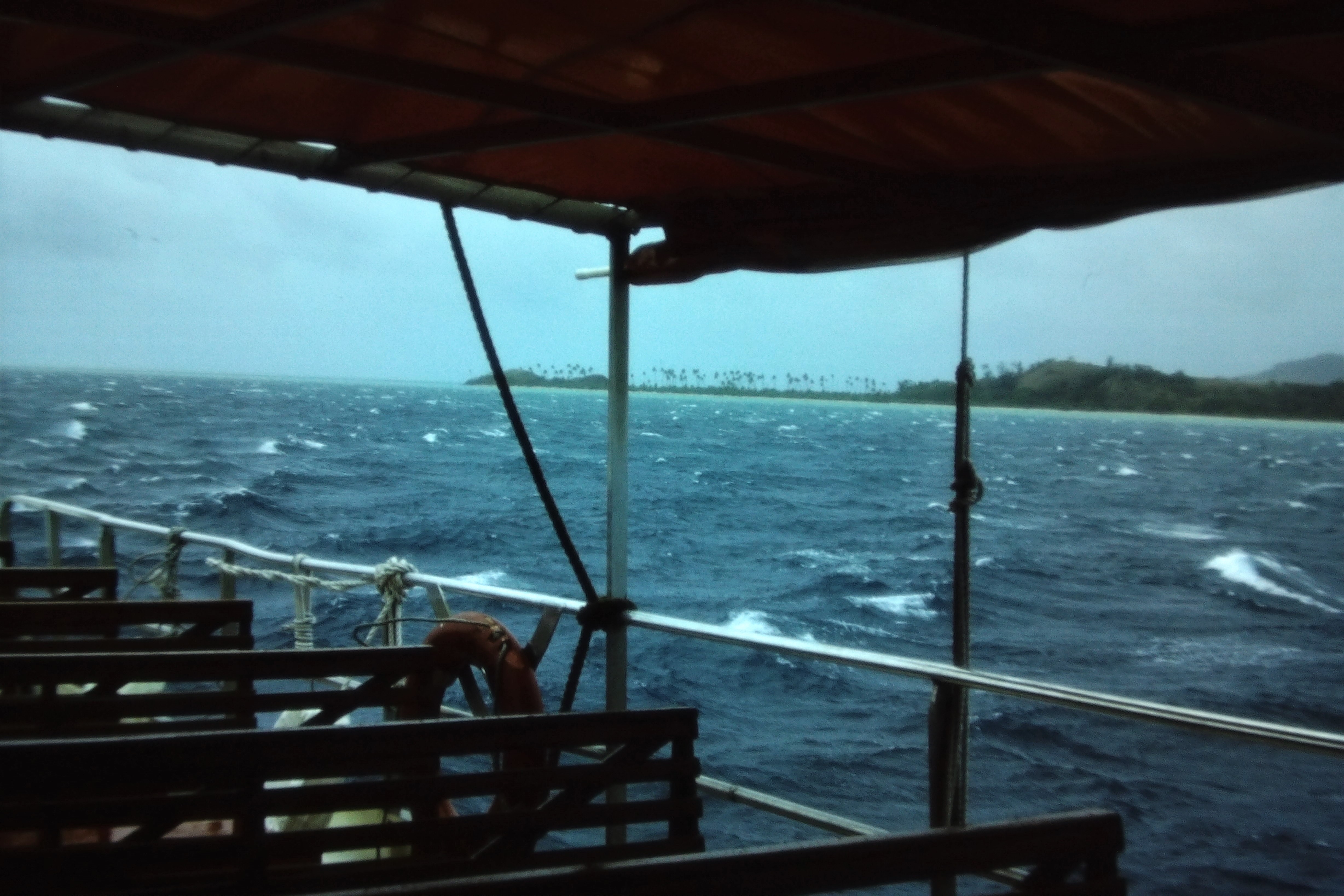 But the boat arrived and departed. Was pretty smooth in the beginning of the trip, picked up some people from other islands, big, nice catamaran-like boat. But then it got bad, giant waves making the boat rock steeply sideways, then up and down between the waves. Every now and then we hit the sea with a bang, heard sounds from the boat that didn’t feel like they should be there, and the splatter from the sea and the waves now reached the top of the boat. Really scary! Didn’t feel any better as Ørjan had to go and sit on the sundeck due to the smell from the toilet beside us. Was nervous about how he coped up there, and was scared he’d fall overboard, would have liked him beside me holding his hand. People got sick and were vomiting everywhere, the crew handed out a lot of plastic bags. Pernilla sat covering her eyes with her hands, very scared too. Had to hold on to the chairs during the worst waves. The only thing that was reassuring was that the crew were very calm and collected. Over the moon when we finally got into the harbour and learning that my love was ok. What a trip – must give thanks for getting through that! Just got back to the room after a visit to McDonalds with Pernilla. Were almost back as the sky opened and heavy rain made us soaking wet within five seconds. The forecast says a cyclone is passing around 360 kilometres offshore, and it’s the results of this we’ve been experiencing today. Hope it doesn’t hit the island and that the flight will leave as scheduled on Friday. Not a particularly nice ending of this trip having to worry about cyclones.
