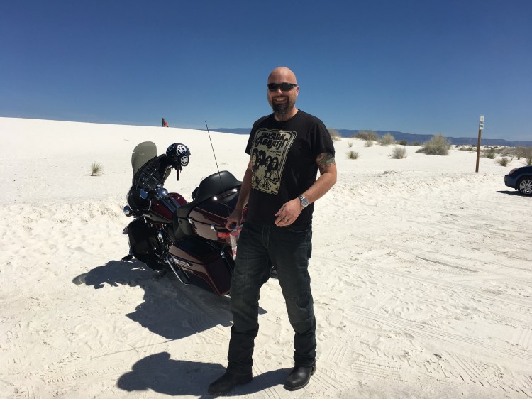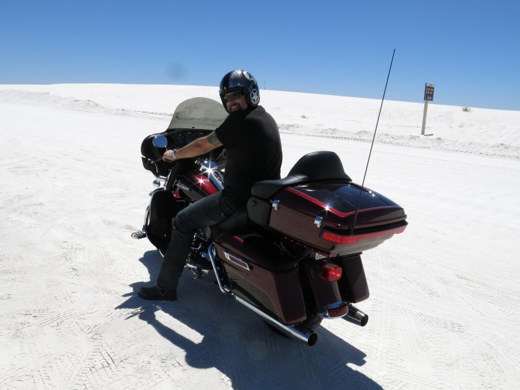 Eaglerider/Barnett Harley was just down the road, and we got a brand-new Ultra to ride. It was another quick pick up, and while waiting for our bike, we got talking with some Indian bikers, who of course started to dis our Harley. All in good humour of course, they said they were going to Cloudcroft, and asked if we wanted to ride with them, but we thanked them politely and said that we had our own route. And we lived to regret our decline of that offer. This is why: if you look at google maps and google earth, the quickest way from El Paso to White Sands National Park looks like Route 213 instead of going Interstate 10 North out of El Paso to Las Cruces and then around the mountains. So we headed to Route 213 and drove in great desert landscape for a long while, a little bemused by all the signs telling us to look out for tanks crossing and military personnel along the road. We passed Fort Bliss Training Centre and Dona Ana Range Complex, all part of the military, and very active in training with live ammunitions and missiles.