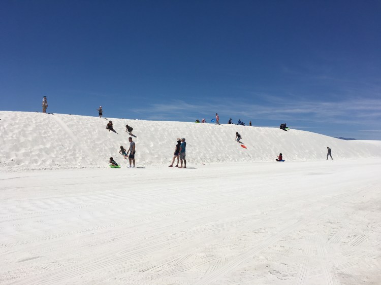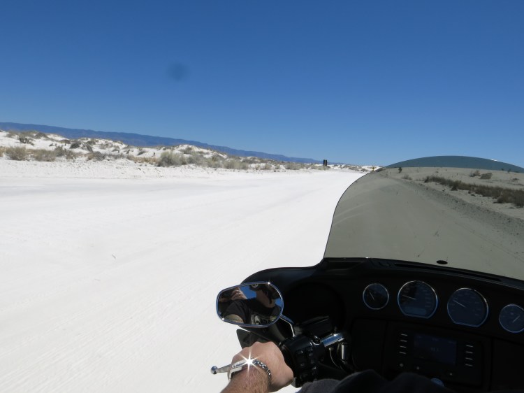 Driving into the park on a motorbike is no problem, at least until the sand starts. You will have hard surface for the first mile or so, but after that it becomes sand, and this sand is very fine, so this makes it hard to ride on. We stopped after a short while on the sand, the chance of doing a tumble was too high, so we left the bike and took a walk on the dunes. The highest dunes are about 18 metres, and plenty of people had small sleds they used to toboggan down the dunes. The whiteness of the sand is fantastic, you could say it’s white like snow, bit being from a snowy country, we can say that this actually looks whiter than snow. It’s so white that sunglasses are a must, the light reflected from the dunes is blinding. The heat, and the strange illusion that this might be snow, makes the whole place seem like another planet. We walked around, but the heat was too much in our riding gear, so we had to retreat to the respite of wind under our wings on the motorbike. We wish we had more time, and visiting by car, so that we could have seen more, but what we saw was amazing.