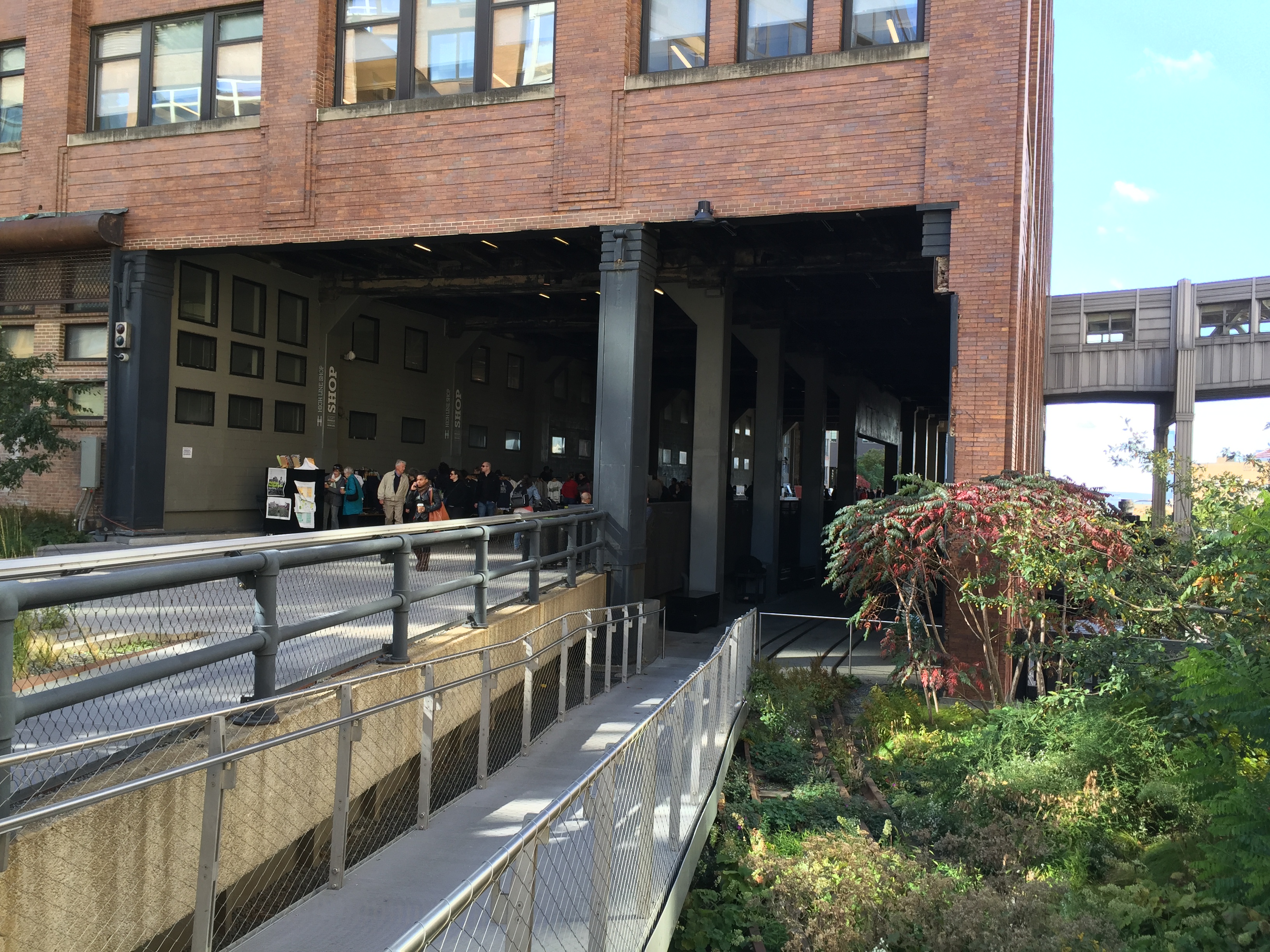 The whole High Line is a gallery, art is spread along the line, great murals are painted on the walls of adjoining buildings and the park is well maintained and groomed. All plants, flowers, trees, and brushes are local and carefully selected by the gardeners. Along the line there are disused spurs that run into warehouses, now planted with wildflowers. In the tunnels running through some warehouses there are vendors selling souvenirs, coffee, water, and other assorted trinkets to commemorate your visit. Along the track there are seating areas, and a small amphitheatre with a window down 10th Avenue. There are magnificent views across Manhattan both to the east and the west down the streets that connect East river with the Hudson river. One of the best views is down 15th Street where you can see the overpass between the Chelsea Market’s two buildings.