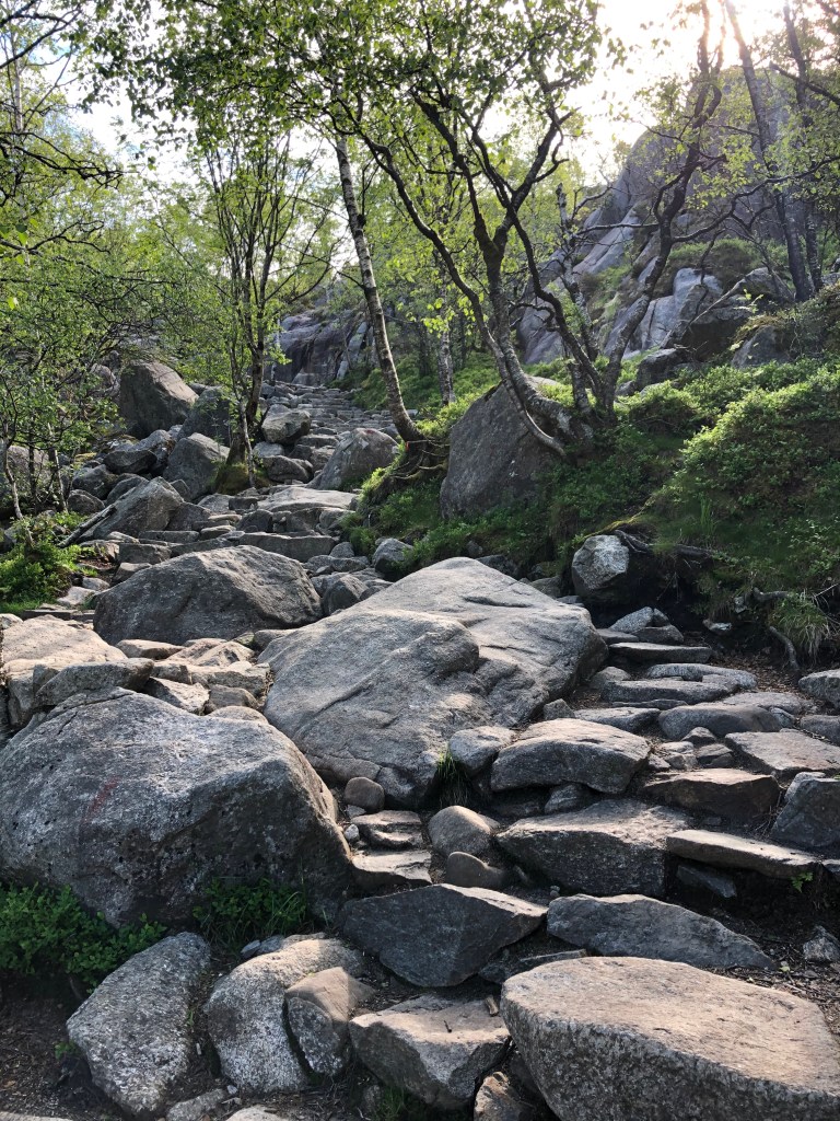 The hike itself is about 4 kilometres (2.5 miles) and has a total incline of 500 metres (1640 feet). This is a slightly tough hike and there will be sweat and need for breaks along the way. We walked in good running/walking sneakers, so either that or good mountain shoes are recommended. Bring water and snacks and/or food for lunch – you will have the possibility to eat al fresco at the most spectacular location. We would recommend starting up at between 8 and 9 am to have a nice start before the throngs of people arrive (there are about 300 000 visitors a year, and most of those will visit from May to September). Some start earlier to catch the sunrise, and this is not a bad idea, just keep in mind that sunrise is around 4am in summer. You can bring a tent and stay for the night, the right to roam act of Norway makes it legal to camp anywhere you like as long as you are not closer than 150 metres (500 feet) of buildings. Since there are no buildings around Pulpit rock, it is a possibility for the adventurous. Keep in mind it is not allowed to camp at the rock shelf itself, so the plateau before you get to the front of the mountain is the best option.