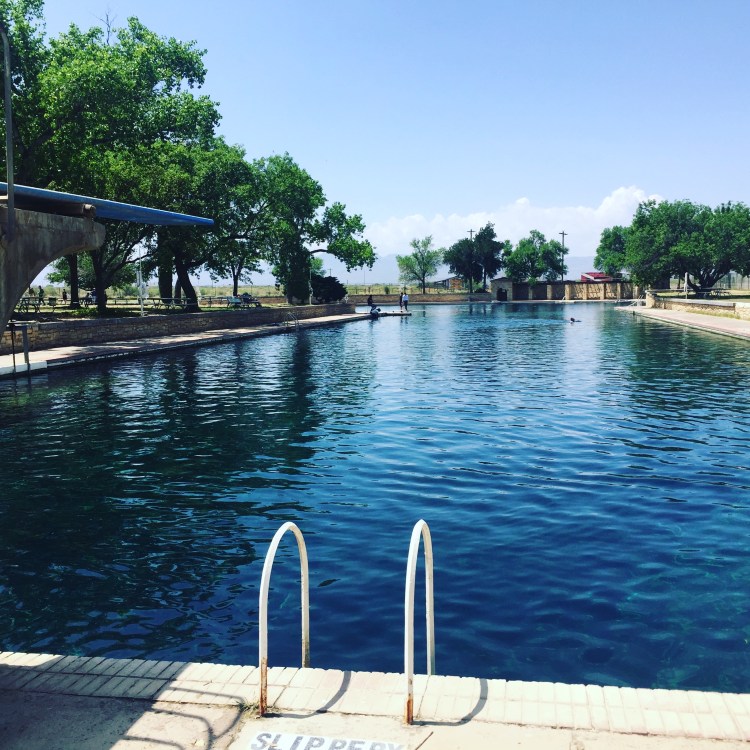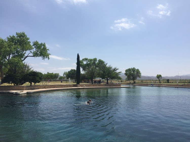 Here lies one of the world’s biggest spring fed swimming pools. Nearby San Solomon Springs has provided water for humans and animals for thousands of years. Native Americans used the springs before the explorers and settlers came into the area. Mexican farmers dug the first canals in the area and used the water for crops. During the Great Depression president Franklin D. Roosevelt created the Civilian Conservation Corps, which provided jobs and job skills by hiring young men to work on conservation projects. This project was used to build the massive pool at the park, a 1,3 acre pool fed from the spring. Together with the surrounding parkland, this whole enterprise was to provide jobs for young men during the depression, and construction lasted from 1935 to 1940.