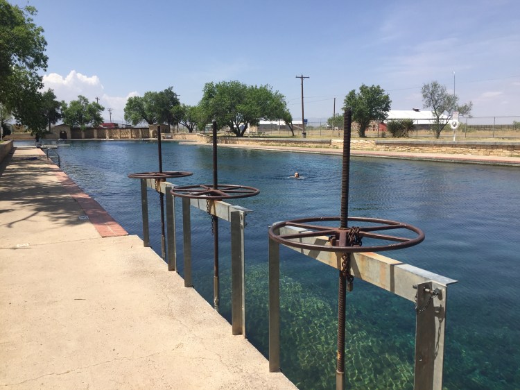 When we arrived, we were more or less alone in that massive pool. The water is crystal clear, more than 15 million gallons (almost 57 million litres) of water flow through the pool every day, and the pool itself holds 3,5 million gallons (13 million litres) of water. There are fishes and turtles swimming in the pool, and you can scuba dive if you want to. The temperature is between 72F and 76F (around 23 celcius) year-round. It was a great respite from the endless plains, a true oasis. We spent a few hours just basking in the sun and swimming around, diving from the dive boards and frolicking in one of the nicest pools we have ever been to.